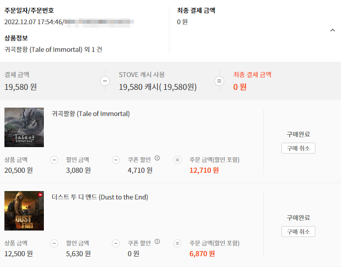[핫세일12]를 입력하면 12% 중복 할인이 되는 쿠폰을 사용하여 2개의 게임을 총 [19,580 원]에 구입했습니다.