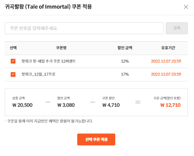 제가 능력이 부족해서 인지, 매일 11시에 충전되는 46%할인이 되는 [핫귀곡팔황12] 쿠폰은 소진되서 사용 불능...