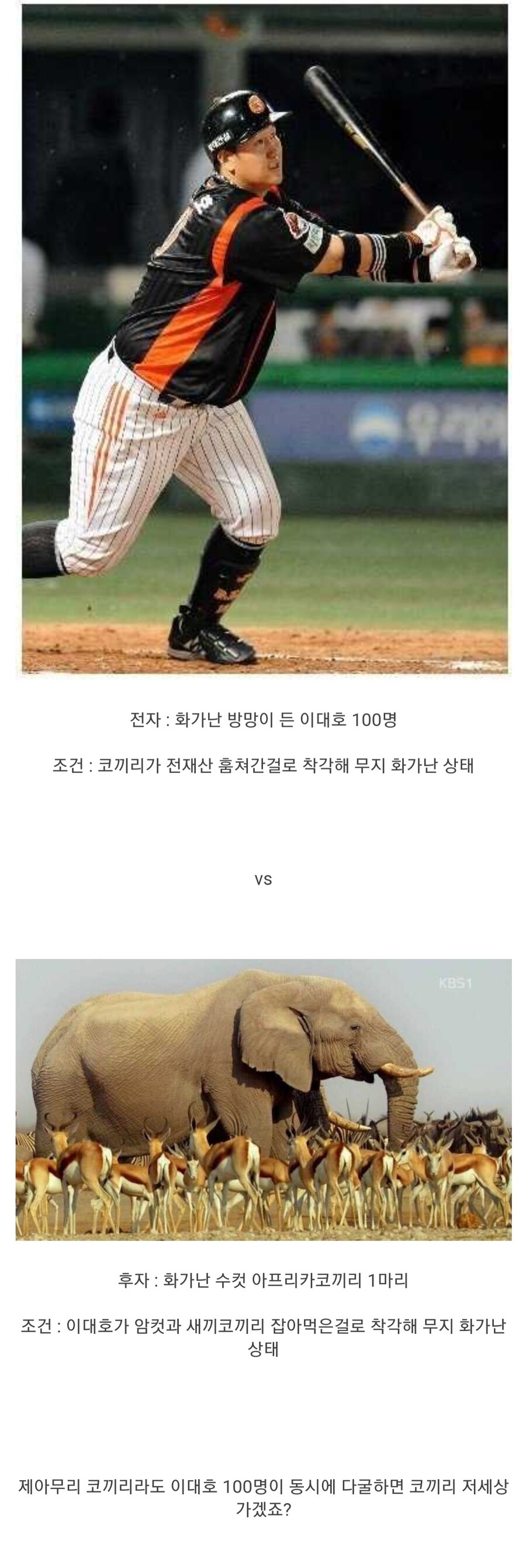 '이대호 100명과 코끼리 1명이랑 싸우면 누가 이길 것인가?'