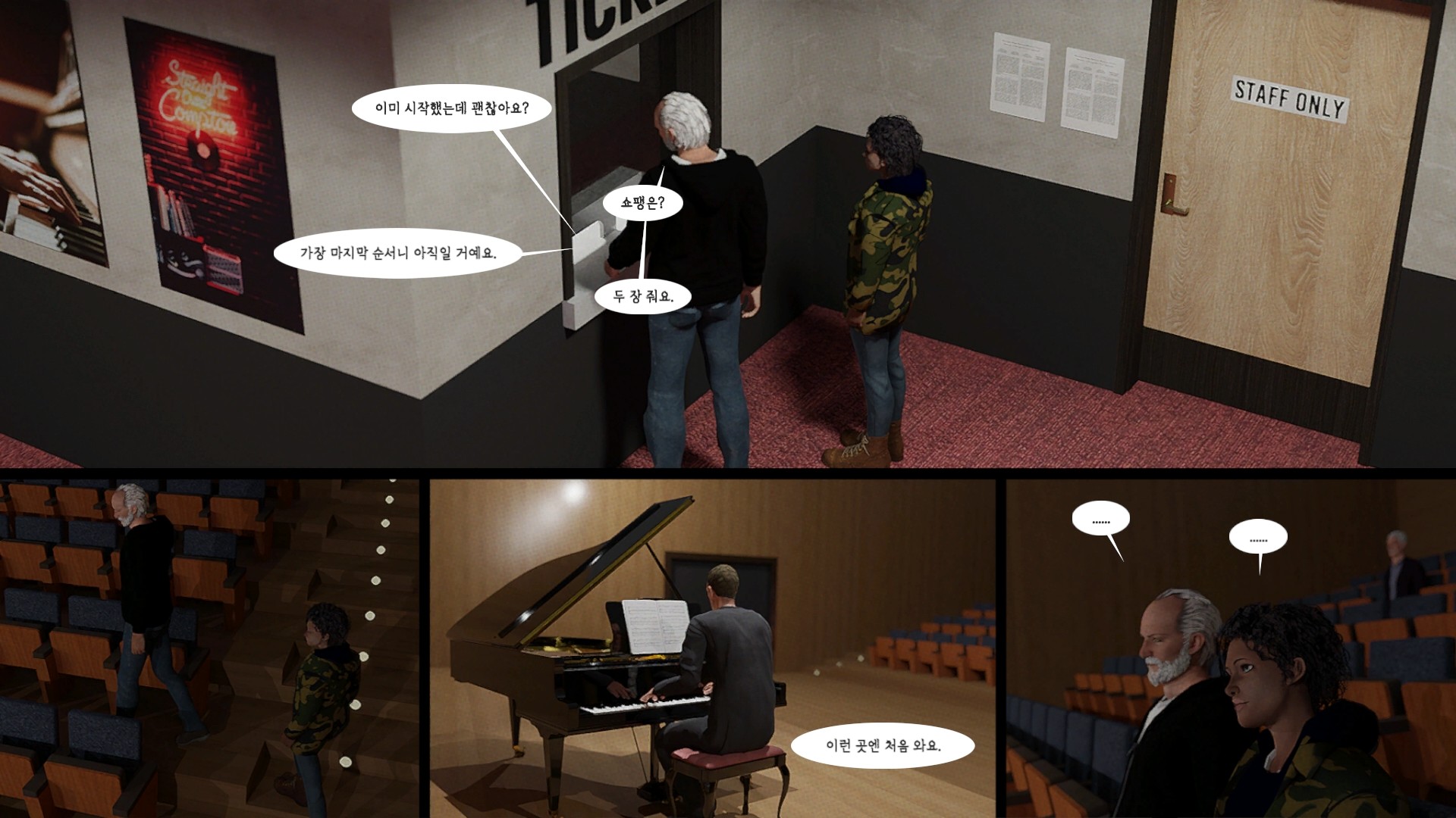 퓨리스 앤 매거진스의 이야기는 각 인물들에 성우가 배정되어 더빙 형태로 진행되거나 한 명의 성우가 쭉 읽어주는 내레이션 형태가 아닌 한 편의 만화를 보는 듯한 느낌으로 따라갈 수 있습니다. 텍스트가 이야기의 순서대로 출력되기 때문에 자연스럽게 인물들이 대화를 주고받는다는 느낌을 받을 수 있고 마치 영화의 자막을 보는 것처럼 흐름을 쫓을 수 있어요.