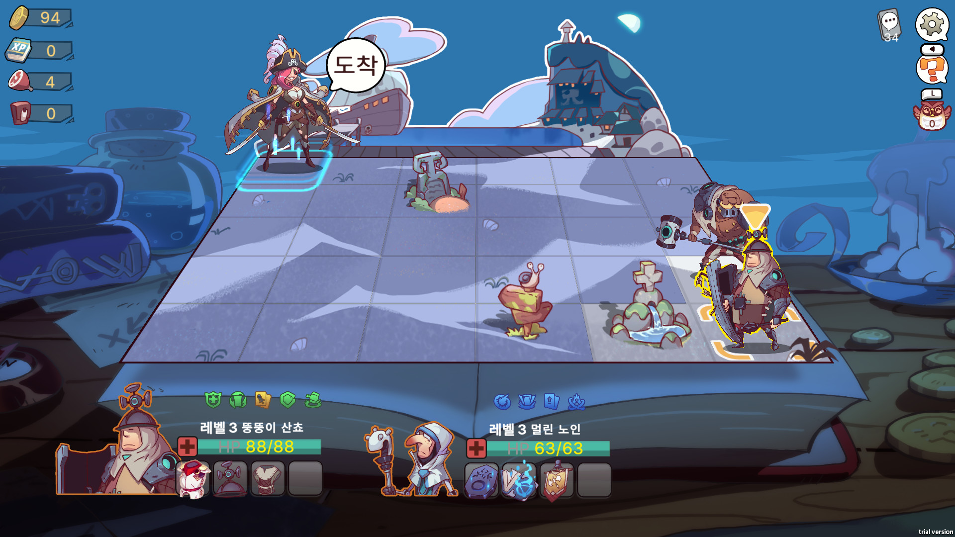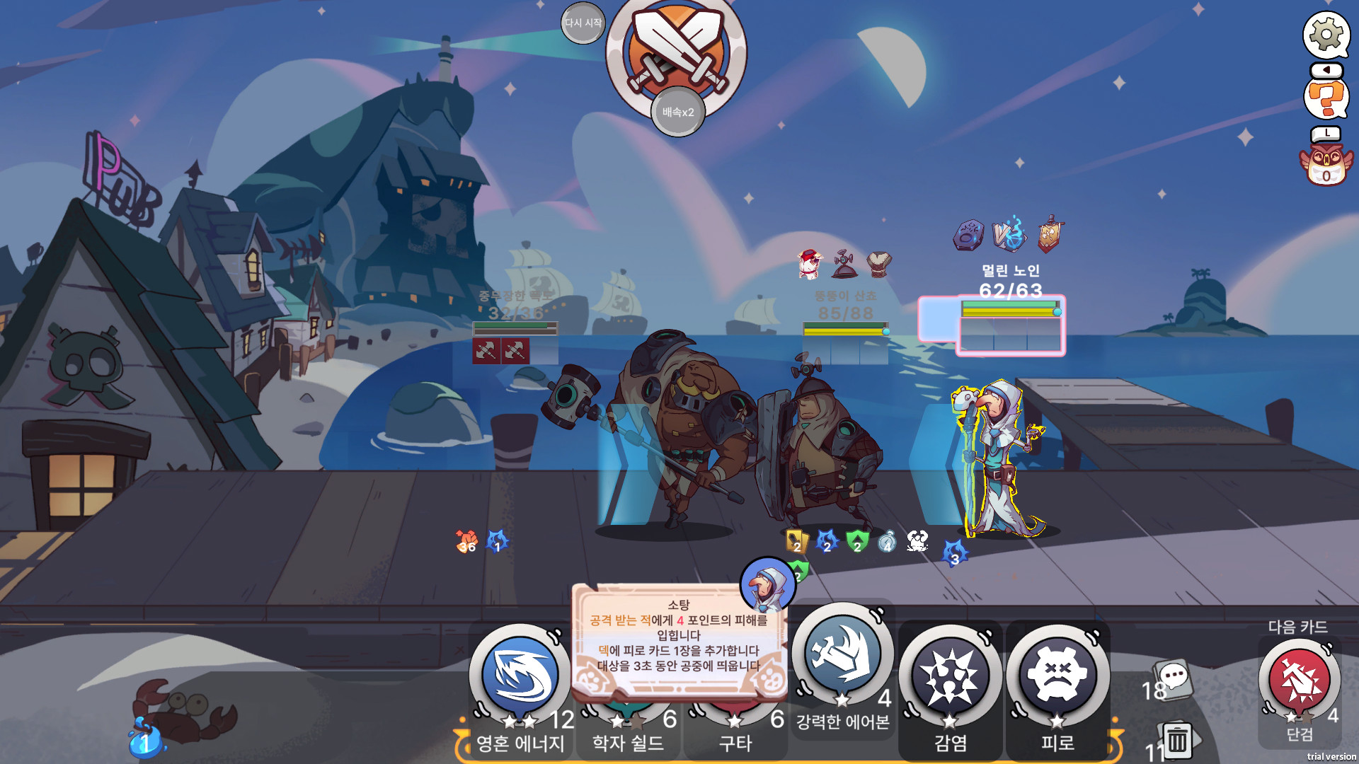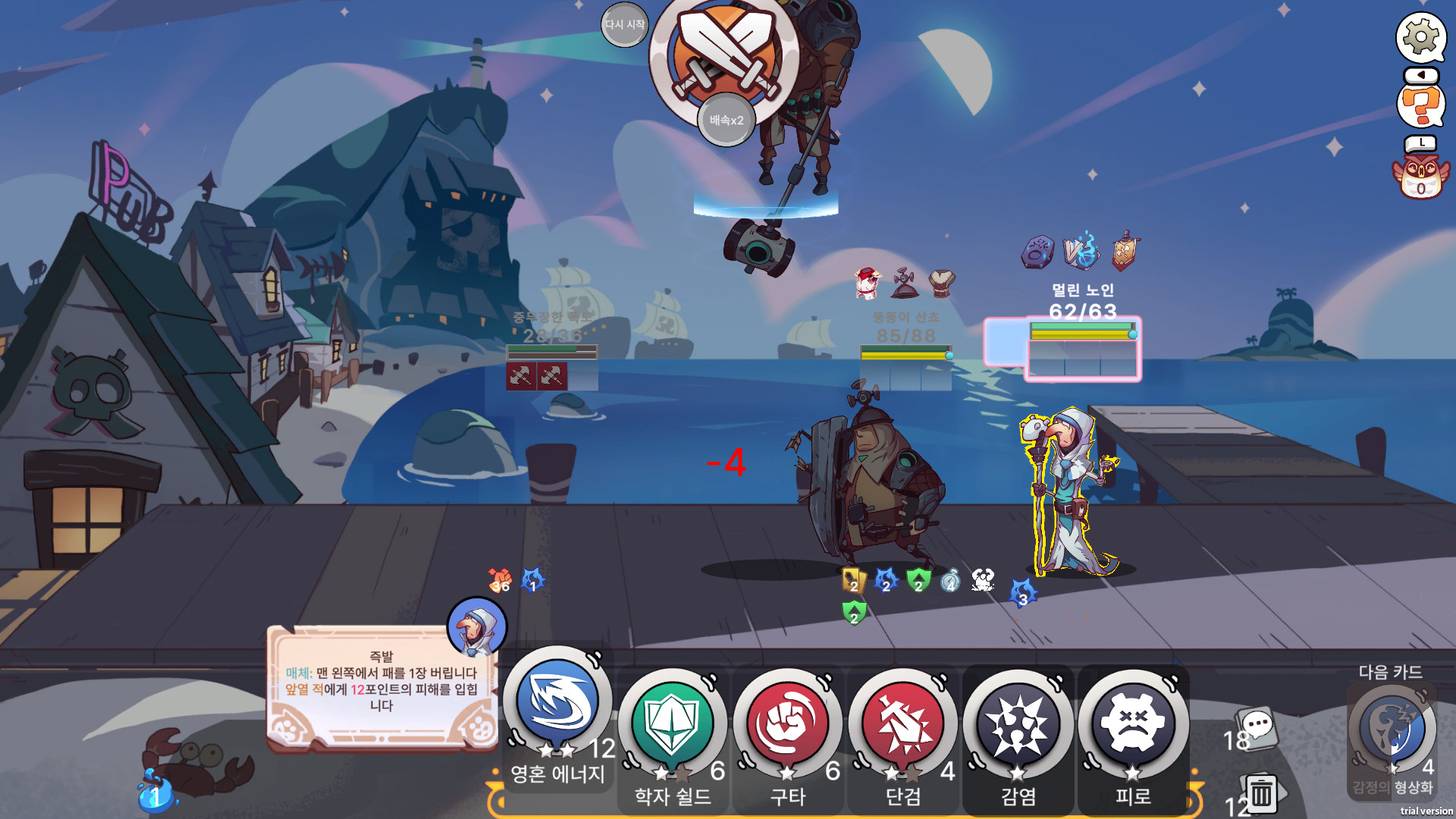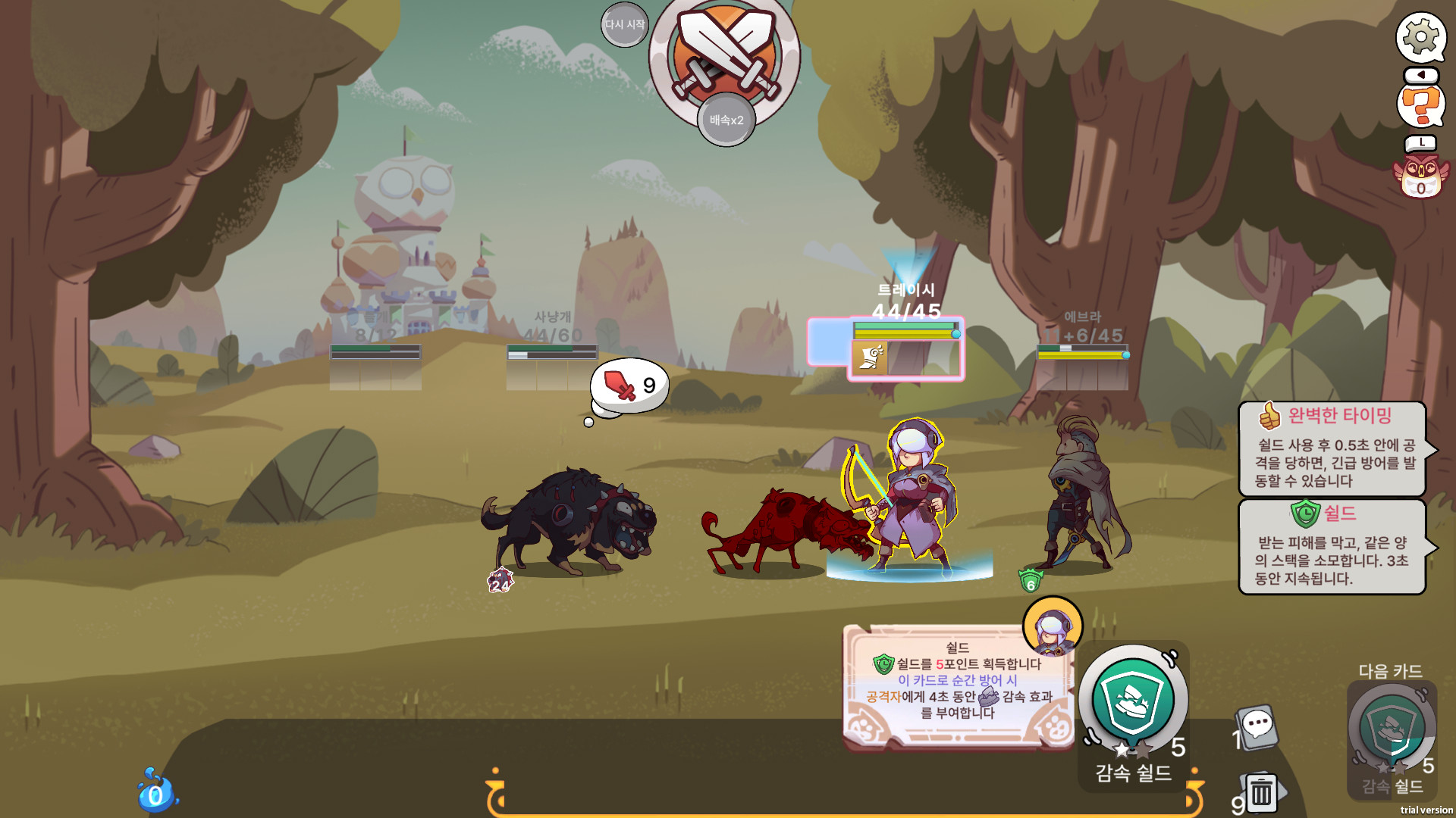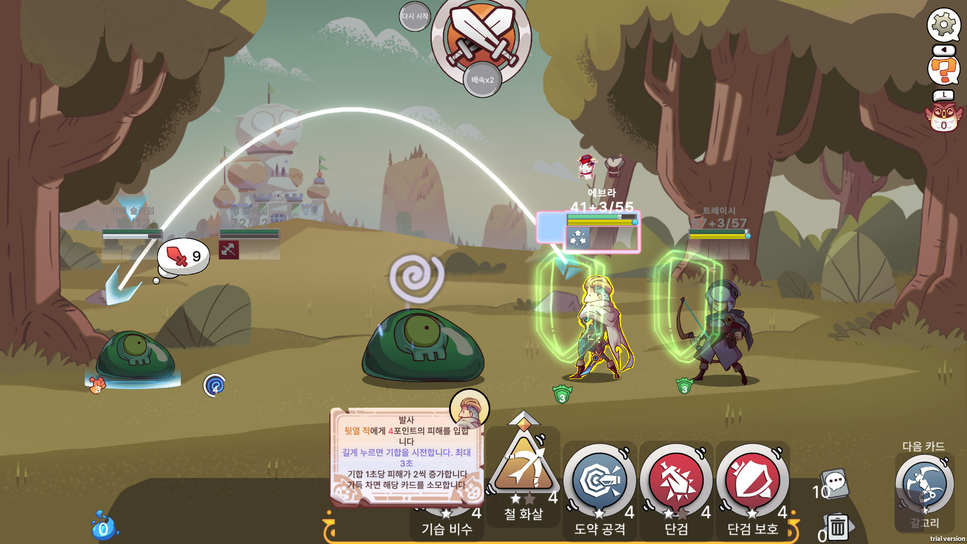 따라서 순발력과 빠른 판단력이 중요하지만 카드에 커서를 이동하면 시간이 매우 느리게 흐르게 하는 방식으로 대응을 할수 있는 시간을 벌 수 있도록 해줍니다. 그리고 다시 하기 기능 있어서 전투를 처음부터 다시 할 수도 있습니다.