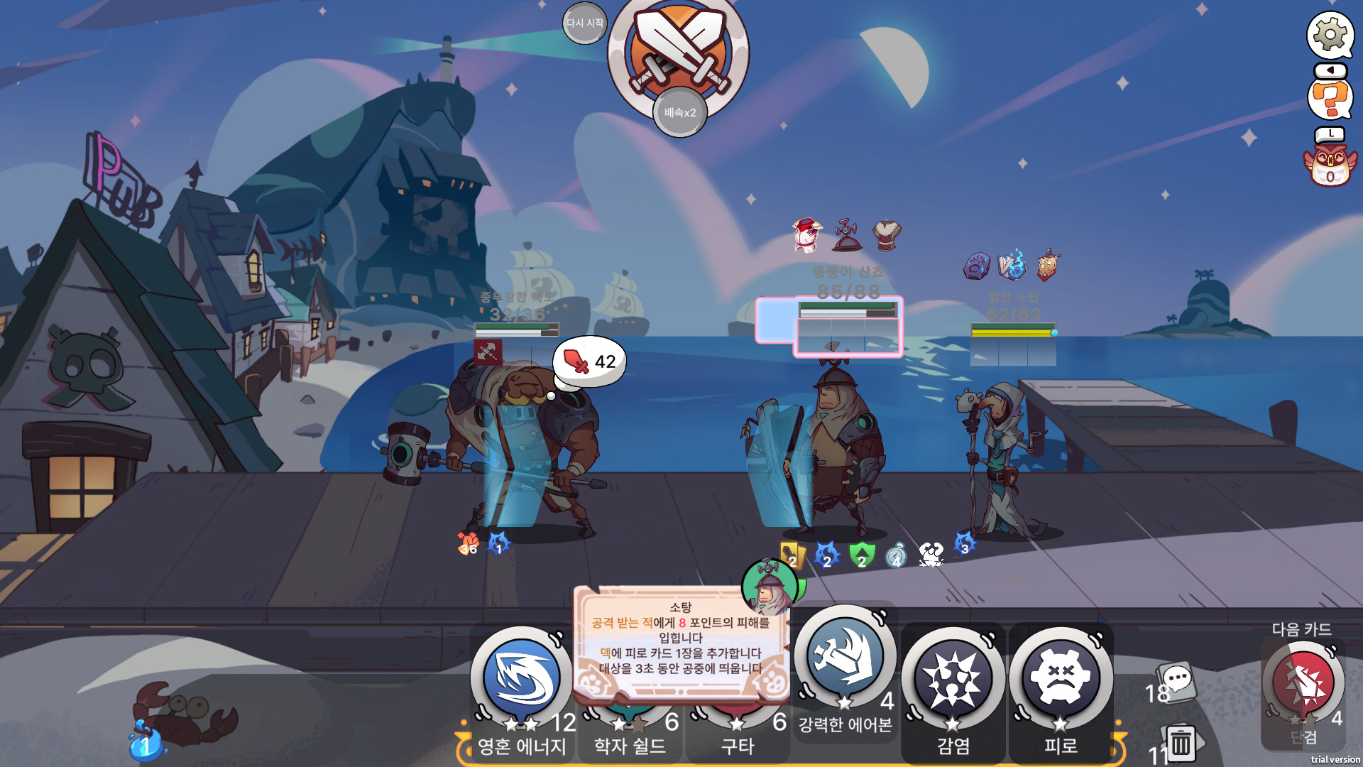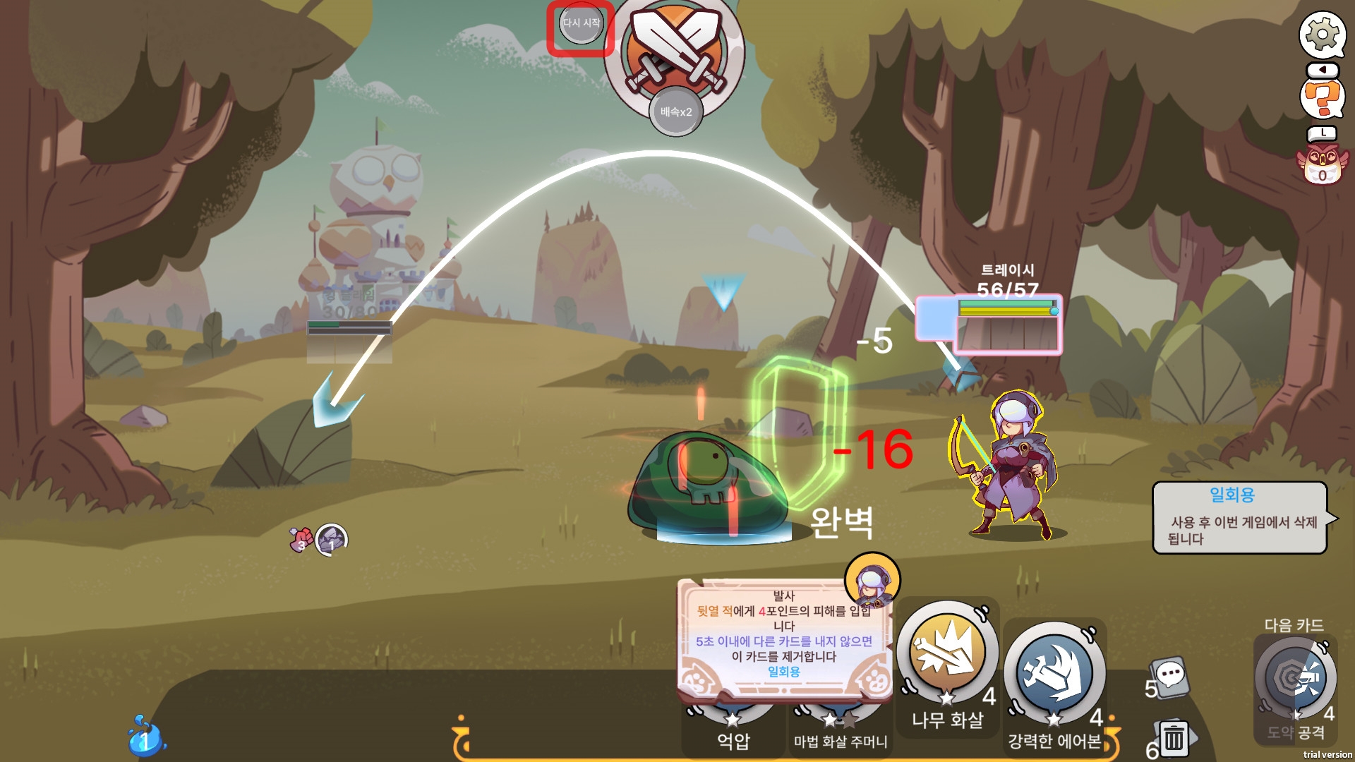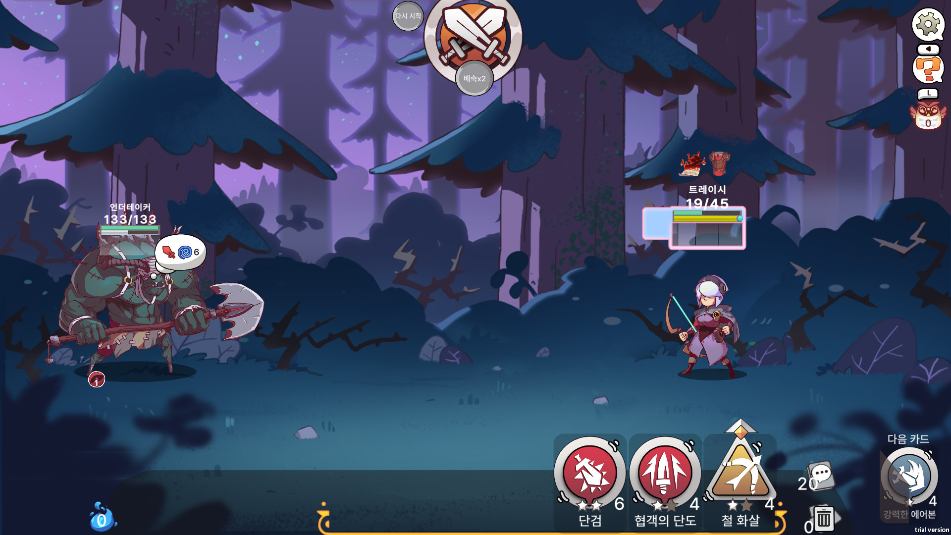 다시 시작을 해도 덱의 순서는 바뀌지 않으니까 전투를 여러번 반복하면서 최적의 공략 방식을 찾는 식의 진행도 가능합니다.