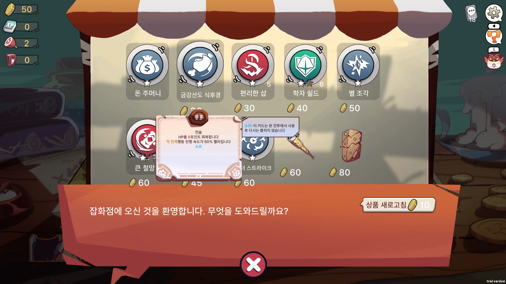 1. 상점에서 금강산도 식후경 이라는 이름의 카드를 팝니다. 이 카드는 사용하면 아군의 HP를 6 회복 시키고 적들의 진행속도를 빠르게 하는 카드인데 약한 적과 싸울때 이 카드를 한번씩 사용해주면 HP 관리가 편해집니다.