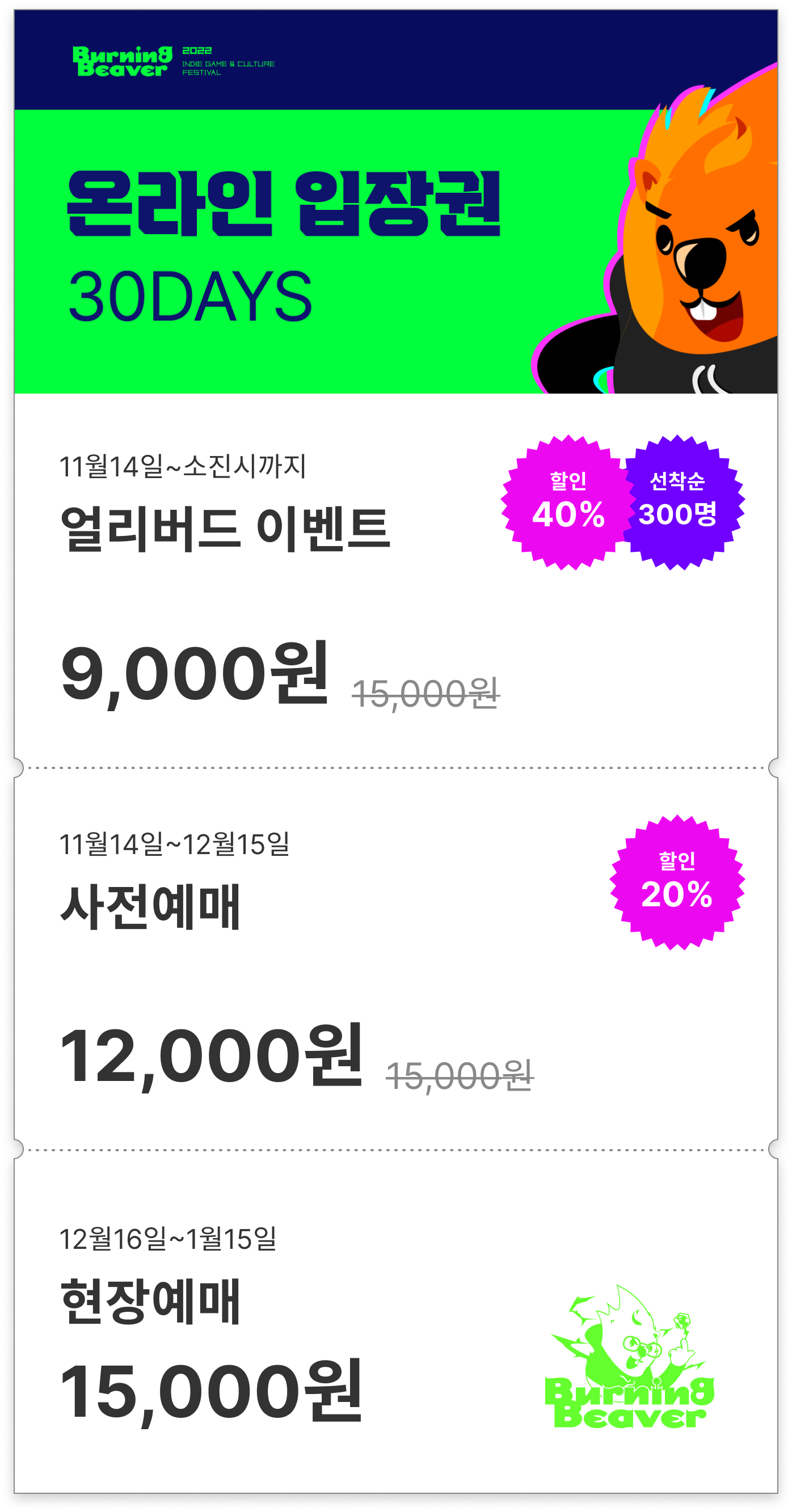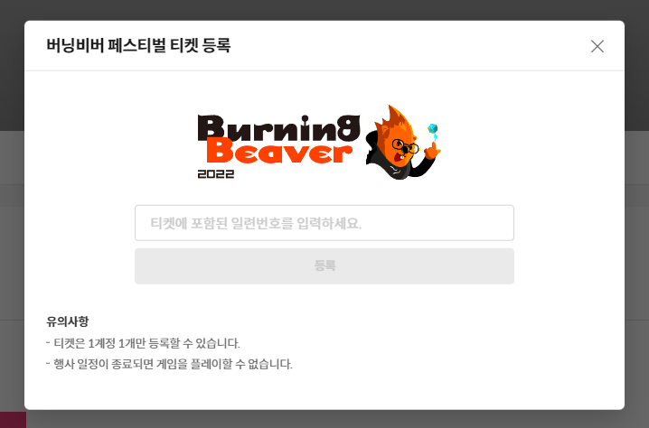 버닝비버 온라인 전시관 이용을 위해서는 입장권이 필요한데요.