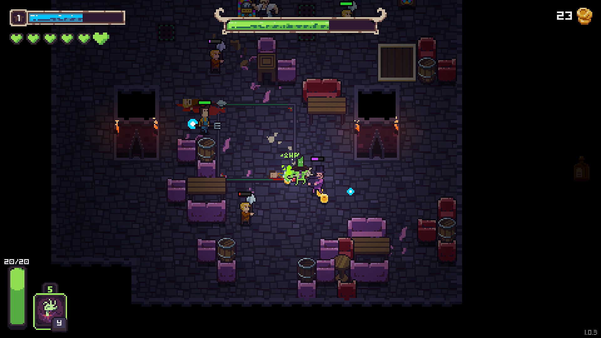 앞서 언급했던 유물 사냥 뿐만 아니라 나이트 클럽 던전의 고객들과 싸우는 전투방 또한 그 종류가 다양하게 나뉜다. 일정 숫자의 적이 무작위로 나타나는 방은 물론이고 정해진 시간 동안 특정 구역 안에서 버티고 있어야 하는 고지전 형태의 방, 적이 무한정 나타나는 와중에 일정 숫자만큼 적을 처치해야 하는 조각상 방, 적이 튀어나오는 수정을 제한된 시간 안에 전부 깨트려야 하는 수정 방, 그리고 여러 도형이 새겨진 기둥을 알맞은 바닥에 밀어넣어야 하는 퍼즐 성 플레이를 선보이는 기둥 방도 존재한다. 이렇듯 단순히 다수의 적을 상대하는 걸 넘어 다양한 기믹의 방이 준비돼있다 보니 방을 이동할 때마다 게임이 환기되는 효과를 제대로 느끼게 된다.
