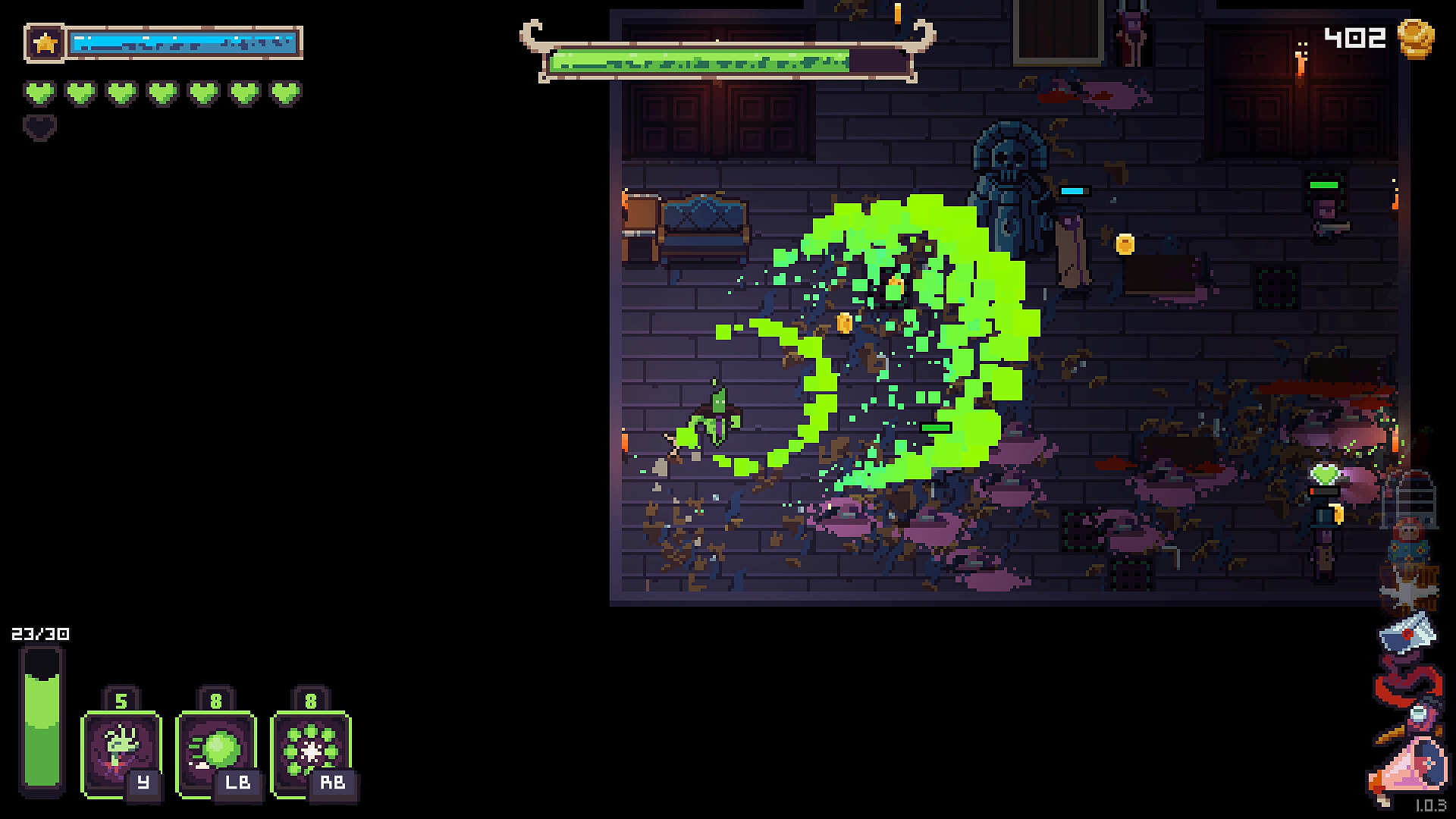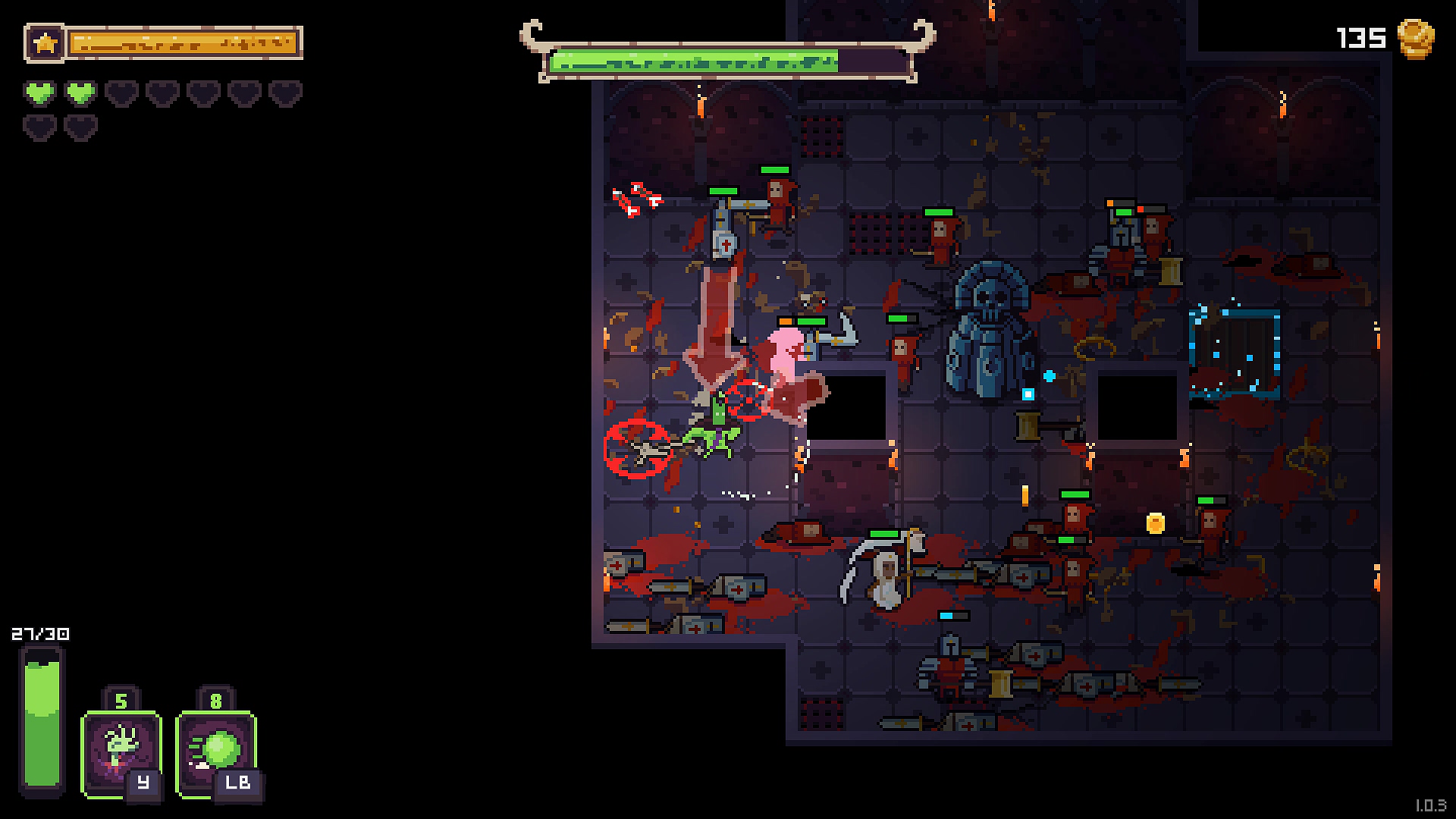 캐릭터가 성장하는 과정에 있어 각 로그라이크 게임마다 크고 작은 차이는 있겠지만, 대체로 아이템이나 스킬을 획득하고 시너지를 극대화한다는 큰 줄기는 잘 따라간다. 그리고 오늘 소개할 로그라이크 게임 네크로바운서(NecroBouncer)는 획득하는 아이템의 수를 대폭 늘려 그 시너지를 폭발적으로 키우는 방식으로 성장의 재미를 끌어올리려 한다.