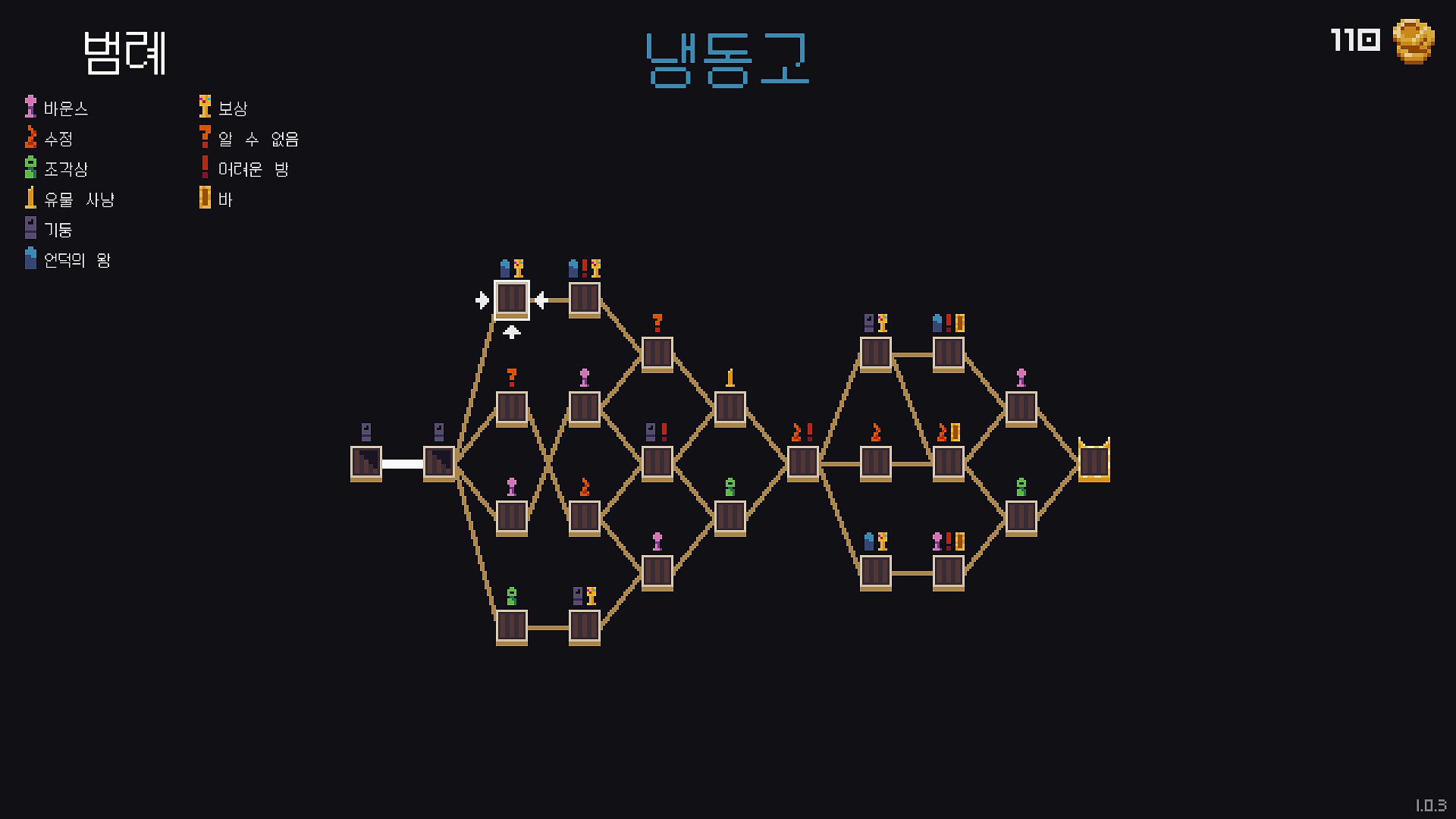 여기에 각 스테이지의 지도는 매번 게임을 플레이할 때마다 다르게 형성된다. 그리고 플레이어는 각 방에서의 전투를 마치고 원하는 유물을 고른 이후 나아갈 방향을 선택할 수 있다. 덕분에 각 스테이지에 처음 진입할 때마다 길을 잘 살펴보고 고심 끝에 최대한 입맛에 맞는 길을 골라서 갈 수 있다. 원한다면 유물을 최대한 많이 노리는 방향으로 찾아 가거나 불필요한 전투를 줄여 피해를 최소화하는 방향으로 찾아 가는 등, 어느 정도 전략적인 대처가 가능한 것이다. 다양한 기믹의 방과 무작위로 생성되는 지도를 통해 로그라이크 특유의 매 판이 달라지는 변수의 요소를 잘 충족시킨 점 역시 흥미롭게 다가온다.