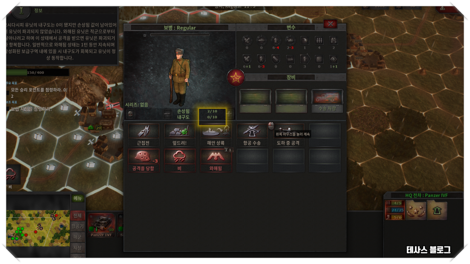 또 기본 체력과 사기로 구분이 됩니다. (In-game에서는 손상됨, 내구도로 구분을 해놓더라고요.)