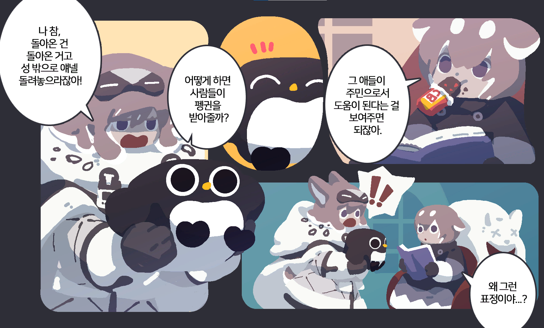 하지만 괴생물체? 인 펭귄들을 성안으로 들일 수 없다는 관아의 입장에 난처하기만 합니다...