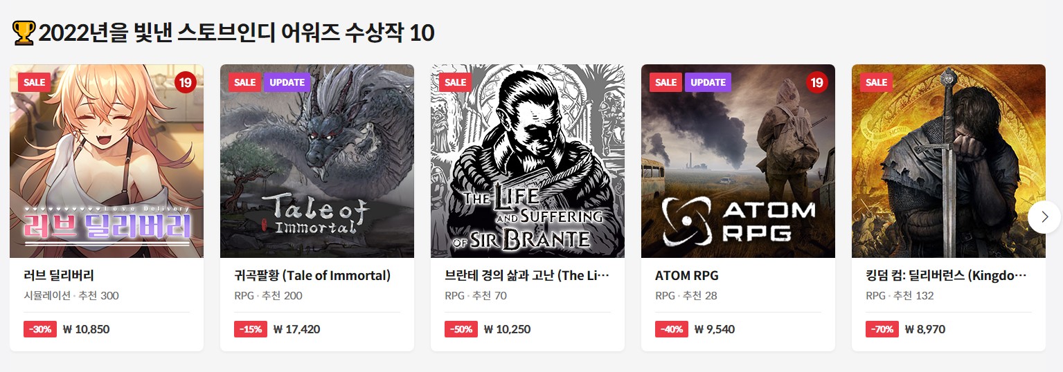 내년에 진행될 2023 스토브인디 어워즈에는 어떤 게임들이 인기를 얻으며 수상작의 영광을 가져갈지 기대해보며 내년에도 열심히 스토브인디에서 다양한 장르의 게임들을 즐겨봐야겠습니다. 현재 스토브인디 어워즈 수상작을 포함해 연말 기념, XX 기념 등등 정말 많은 이유로 정말 많은 게임들이 할인을 진행하고 있으니 할만한 인디 게임을 찾고 있는 분들이라면 빠르게 스토브인디 게임 페이지를 열어보도록 하자구요.