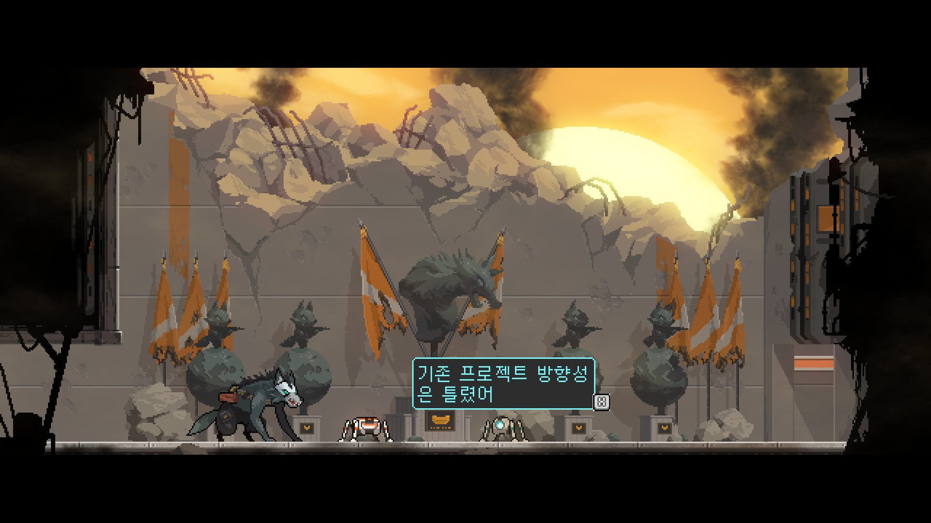 <로봇들이 늑대와 싸우지만 패배합니다.>