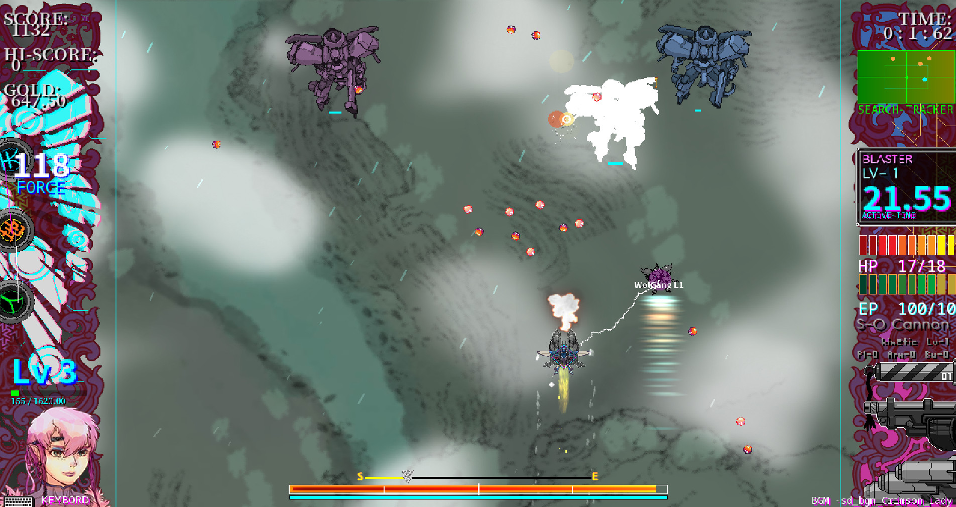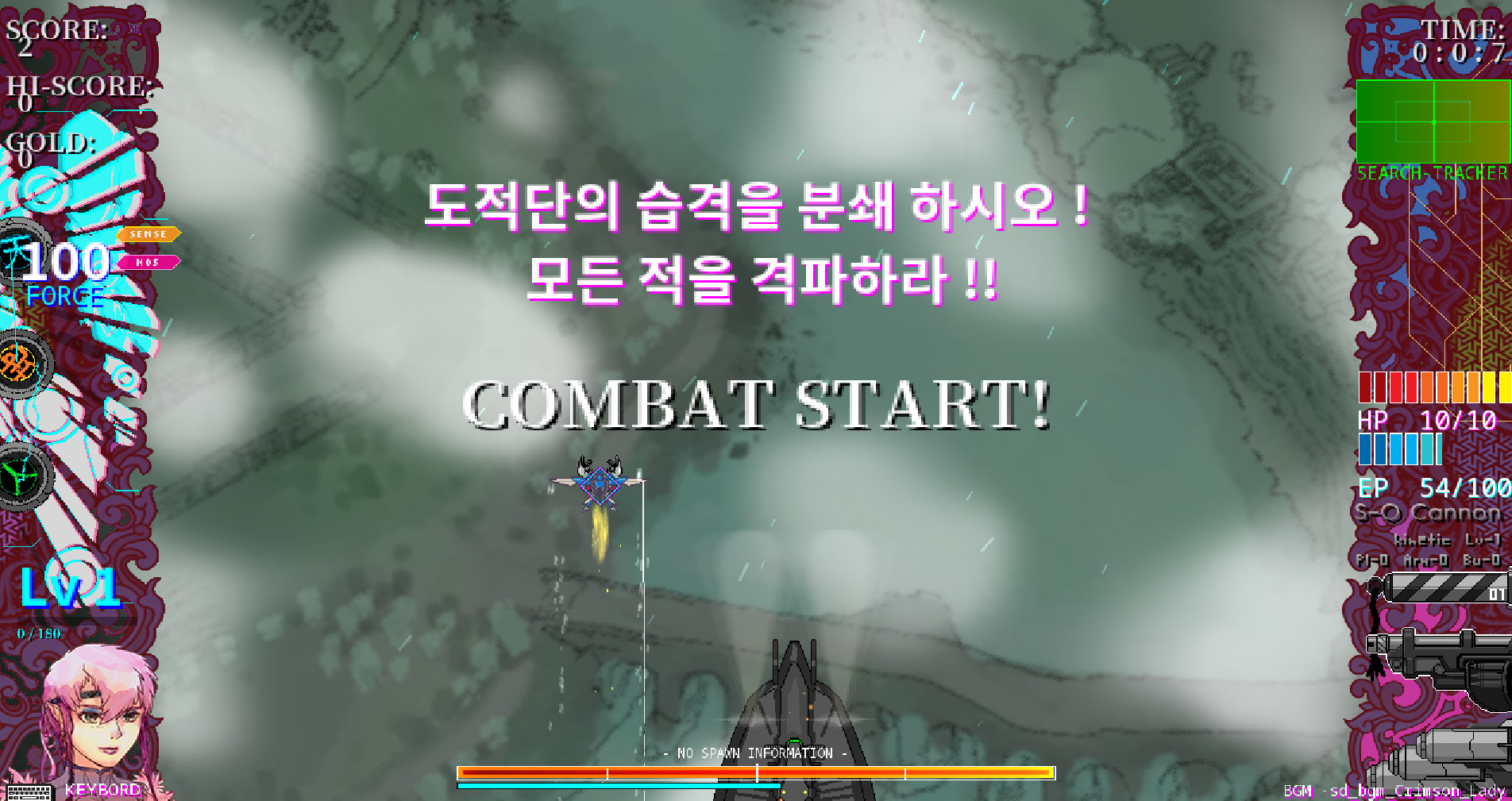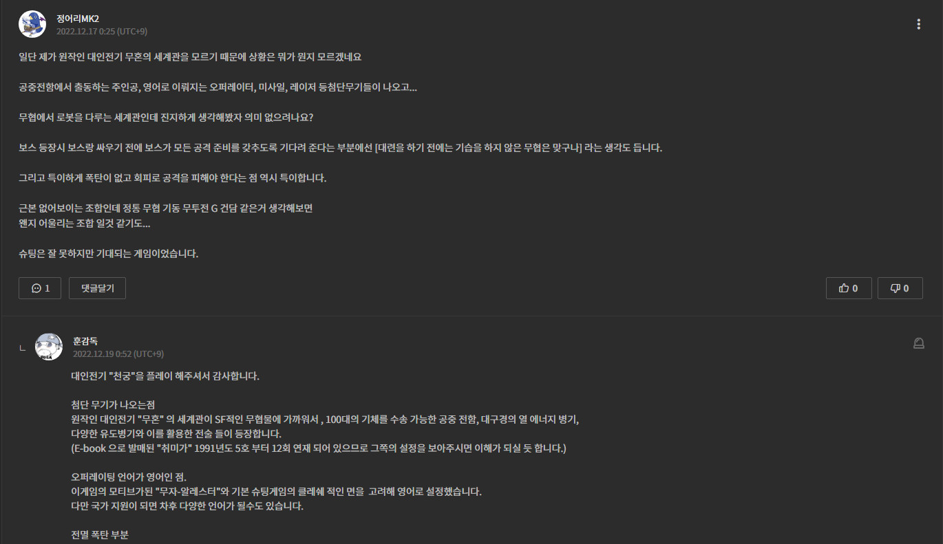 대인 전기 천궁은 거대 로봇과 비행 전함이 존재하는 세계관을 바탕으로 한 무협 작품입니다. 일단 진행 자체는 SF 적인 느낌의 슈팅 게임이지만, 중간중간 무협 용어가 나오면서 일반적인 슈팅과는 다른 느낌으로 진행됩니다.