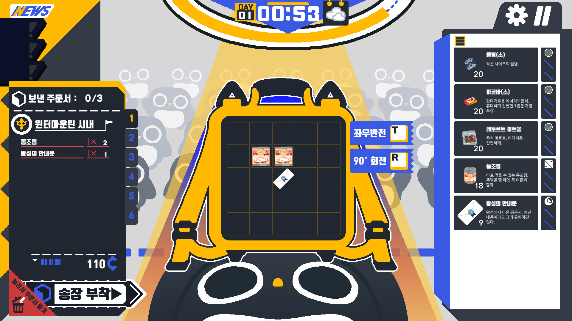 게임의 진행 방식은 주문서에 맞춰서 물건을 넣고 송장을 부착해서 펭귄들에게 전달하는 식입니다.