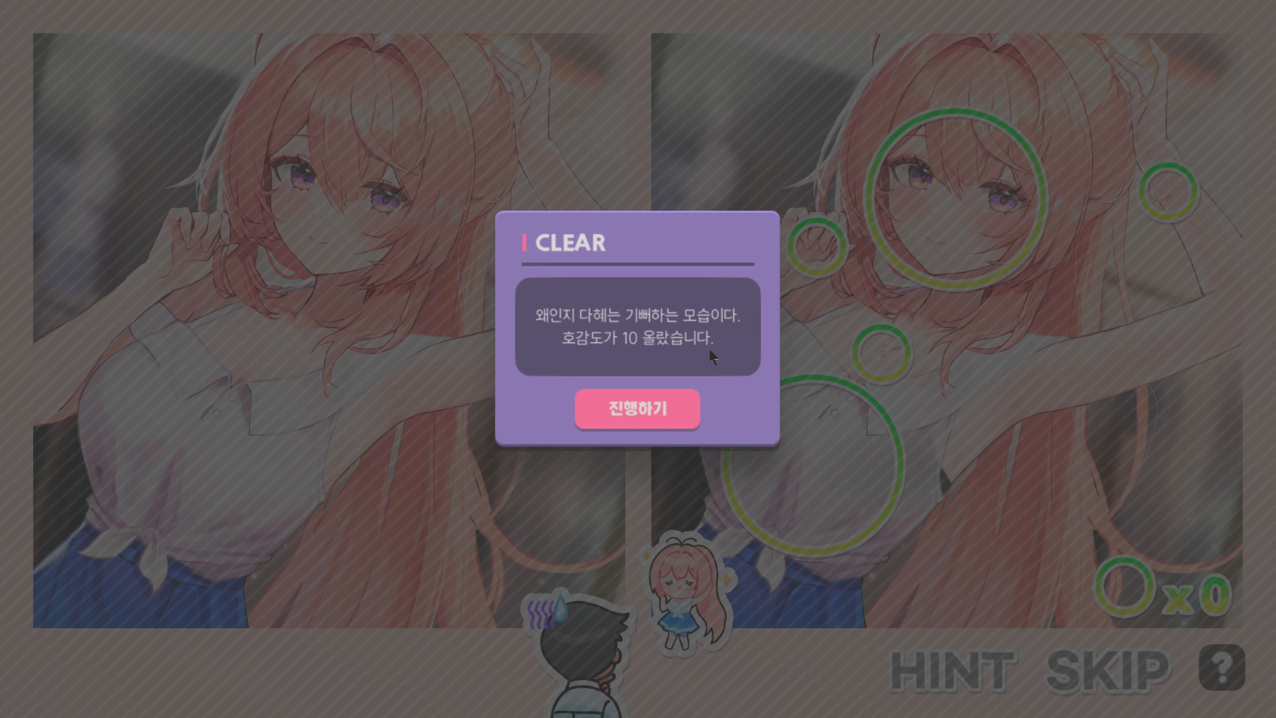 총 10개의 미니게임이 있고, 미니게임을 성공할 때마다 10 호감도를 쌓을 수 있고, 미니게임 스킵 시 5 호감도를 쌓을 수 있다.