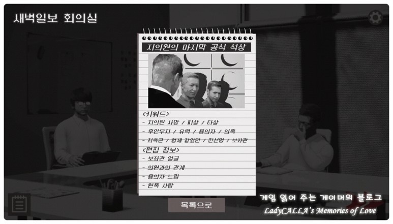 체험판에서 플레이 가능한 '지광현 의원의 피살'과 관련된 기사 발행 단계를 예로 들어보자면, 지광현 의원의 생전에 그의 측근과 함께 찍은 사진을 바탕으로 사진 속 인물들에 대한 기본적인 정보들을 먼저 파악해야 한다.