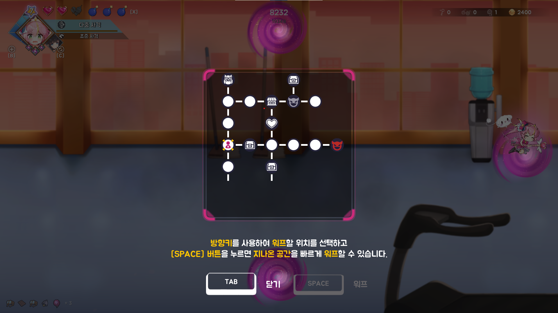 3층 첫 번째 방을 클리어했는데 다른 방으로 진행이 불가능한 상황입니다. 그런데 이상하게도 맵이 밝혀져 있습니다.