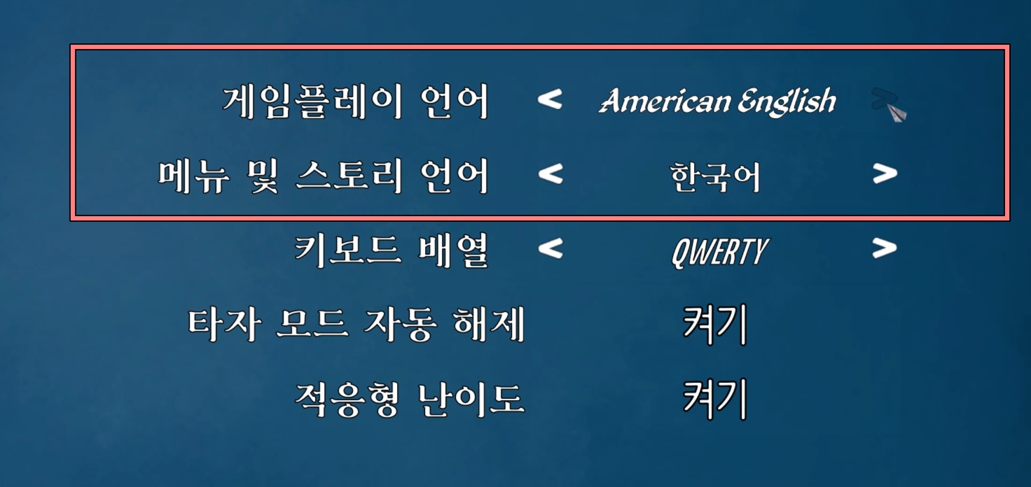 그렇기에 플레이 시 설정화면에서 위와같이 '메뉴 및 스토리 언어'만 한국어로 바꾸고 '게임플레이 언어'는 영어로 설정하고 플레이하시는 것이 가장 좋습니다. 이러면 타이핑해야하는 단어만 영어로 나오고 그 외 부분은 한국어로 나오기에 영어 타이핑을 해야 한다는 점만 제외하면 쾌적한 게임을 즐길 수 있죠.