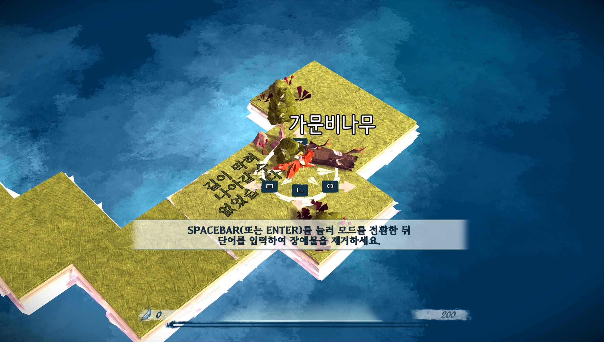 이 게임의 핵심을 이루는 타이핑 전투는 다가오는 적의 머리에 띄워진 단어를 타이핑해서 적을 처치하는 방식인데요. 한글이었으면 스피드런도 가능했을텐데 참으로 아쉽습니다. 분명 공식한글화인데 번역까지만 이루어지고 타이핑에 대한 부분은 영어 버전 그대로인것으로 보입니다. 한글로 진행 시 인식이 안되기 때문이죠.