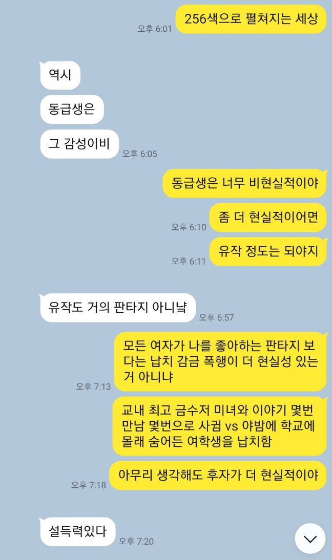 둘 다 현실에서 일어나기 힘든 일이지만 나에게 해당되지 않는 것만 현실적이지 않다고 하는 것은 으음 ㅋㅋ