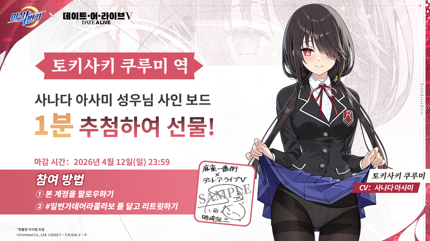 We will give an autographed board of #사나다아사미, the voice actress of Kurumi Tokisaki, to one lucky user through a lottery!