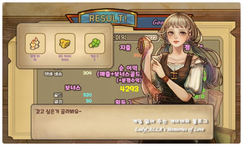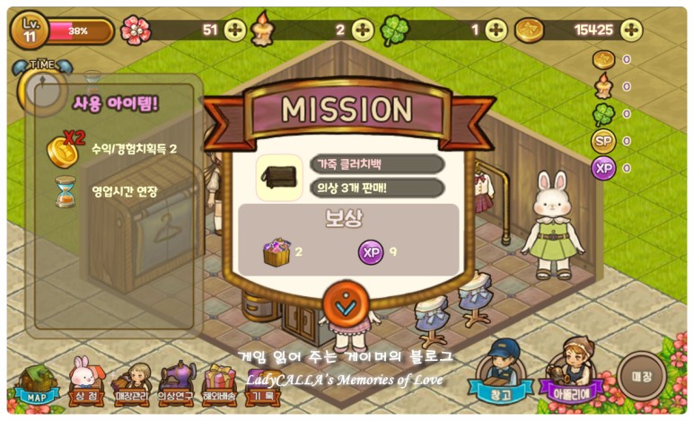그날의 미션 템의 제작이나 판매 성공 시, 게임 진행에 도움을 주는 아이템 및 경험치 보상을 받을 수 있다.