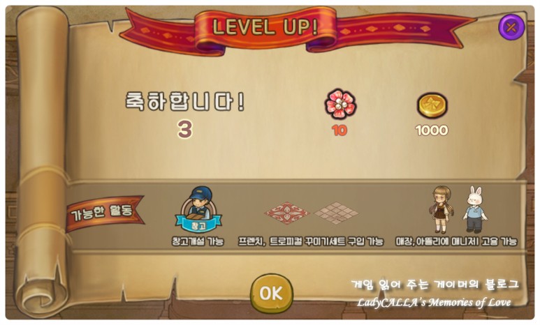 게임 진행 중에 획득한 경험치들이 쌓여 레벨 업을 하게 될 때마다 보상으로 재화와 함께 아이템이나 고용 가능한 직원들이 추가된다.