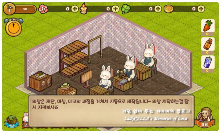 아뜰리에에는 재단, 미싱, 데코를 담당하는 토끼들이 나란히 줄을 지어 앉아서, 플레이어로의 지시에 따라서 작업을 진행해 나간다.