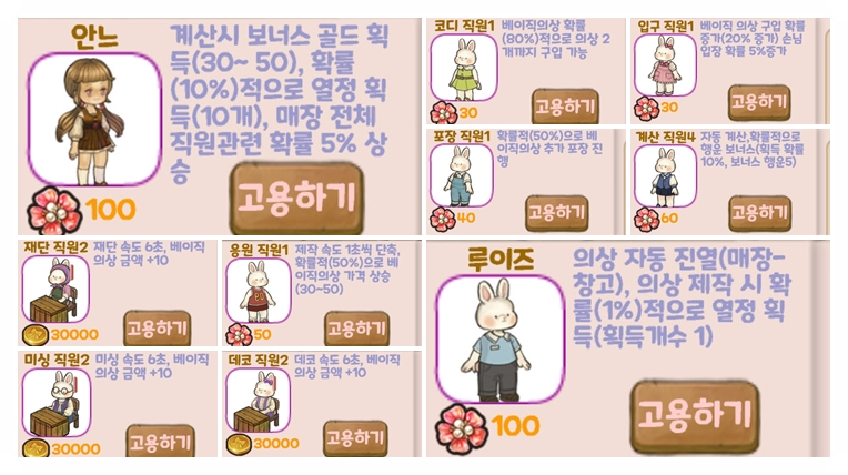 직원들은 저마다 능력치가 있어서 동일한 아이템을 판매하더라도 어떤 직원들을 고용하고 있느냐에 따라서 추가적으로 더 많은 골드는 물론이고, 부수적으로 '열정'이나 '행운' 같은 추가 재화들 획득도 가능하다.