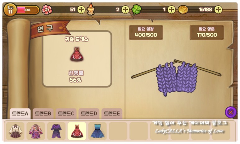 다음으로는 게임 진행 중 다양한 경로로 입수할 수 있는 '열정'과 '행운'을 사용하여, 다양한 트렌드 의상을 연구하여 해금시키는 것