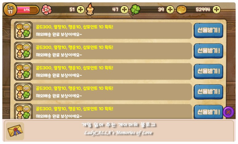 전날 해외 배송에 열심히 참여했다면 이렇게 다음날 우편함 터지도록 보상을 가득가득 받을 수 있으니, 3레벨 & 3만 골드 모으기에 성공했다면 그 무엇보다 창고 개선을 우선으로 진행하도록 한다.