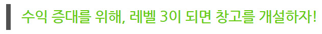 📌 3레벨에 창고도 개방할 수 있지만, 이건 조금 있다 설명하도록 하겠다.