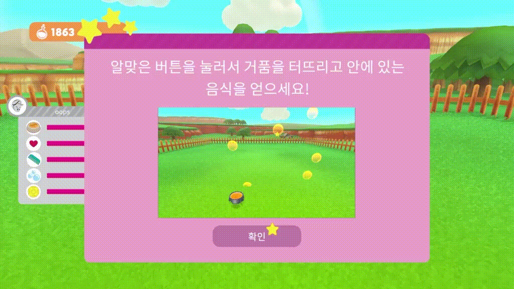밥을 주려면 각 동물들 마다 먹이가 달라서 미니 게임들이 존재하는데