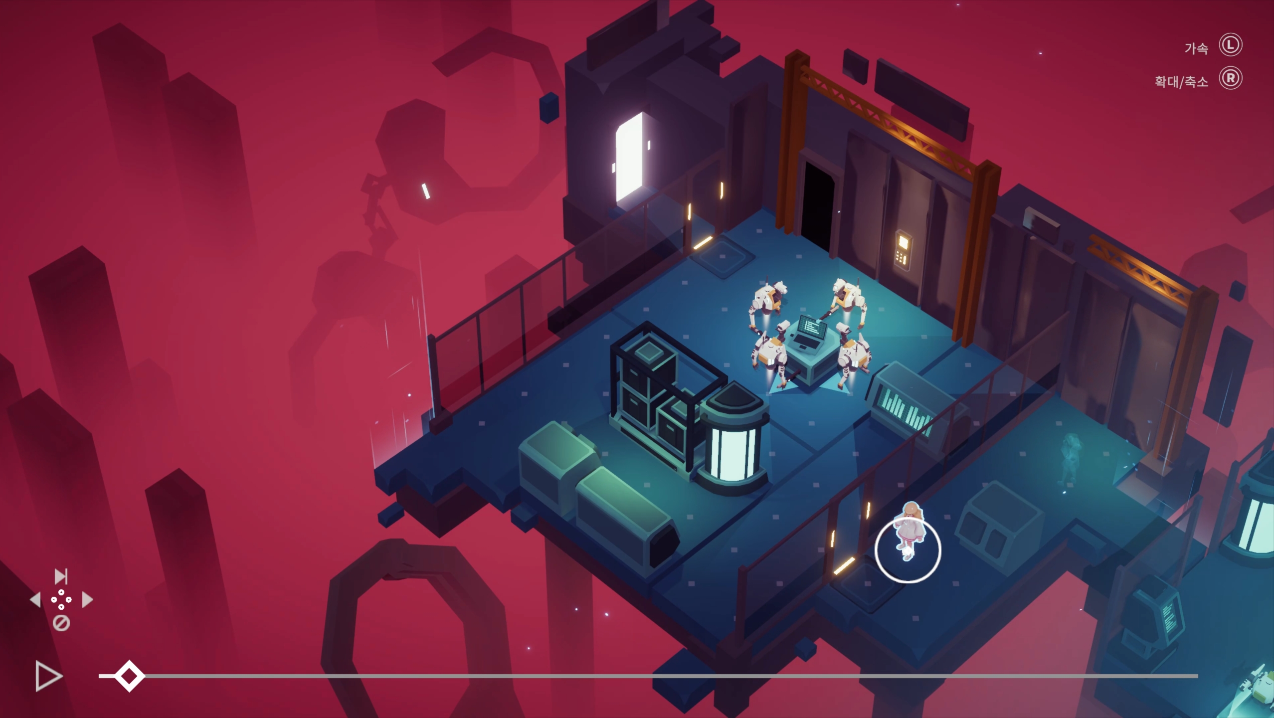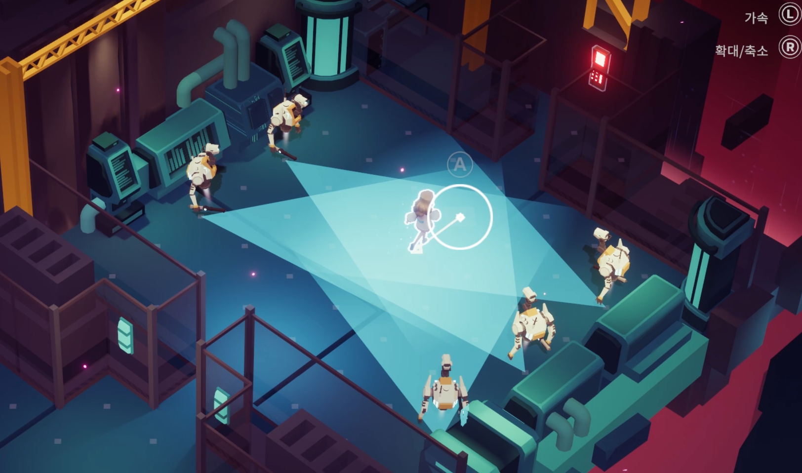 게임은 크게 챕터로 구분되며 그 안에는 여러 개의 스테이지로 이루어져 있죠. 그리고 각 스테이지는 여러 로봇이 패트롤을 하고 있으며 그걸 피해서 우리는 소녀와 고양이를 다음 스테이지로 향하는 문으로 인도해야 합니다.