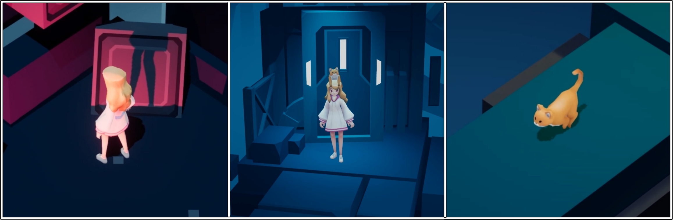 이 작품에서는 소녀 그리고 고양이가 등장하죠. 그리고 그 둘이 합체를 하면 인묘합일 캣걸이 됩니다. 강력 그 자체죠. 물론 전혀 아닙니다. 제 말은 곧이 곧대로 들으시면 안됩니다. 하지만 이 둘이 주인공이라는 점은 사실이죠. 우리는 작중 이 두 캐릭터를 동시에 컨트롤해서 적들을 피해 게임을 진행해야 합니다. 둘을 동시에? 하지만 귀여웠죠!