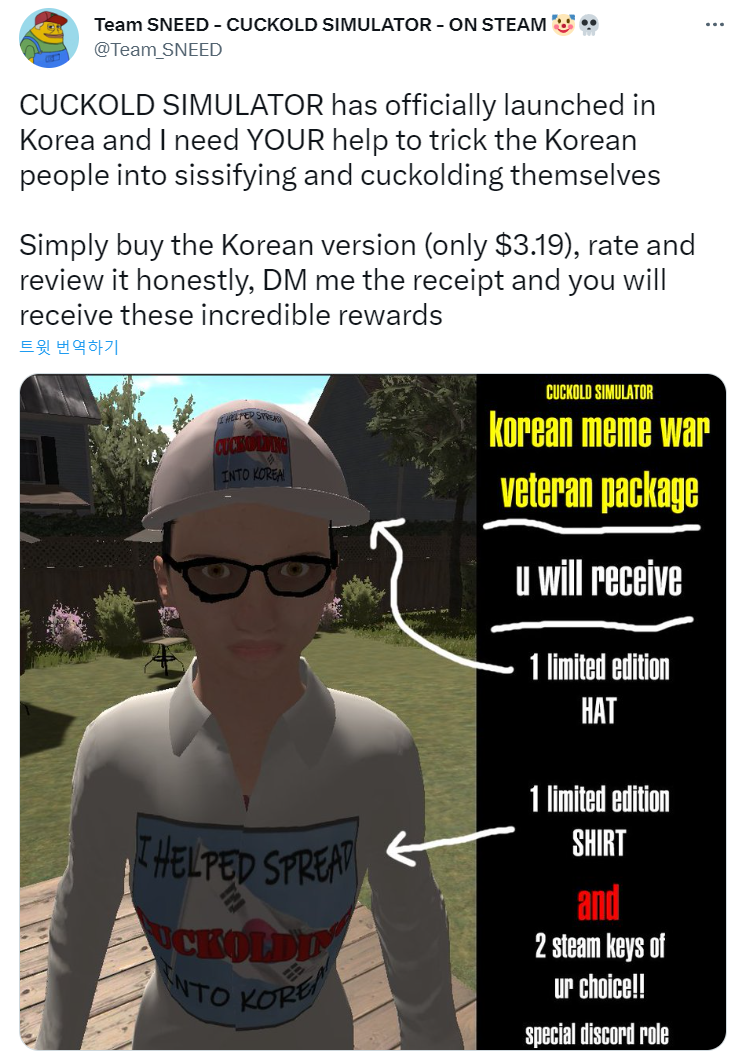 "나는 뻐꾸기남 시뮬레이터가 한국에 전파되는 것을 도왔습니다"라는 문구가 적힌