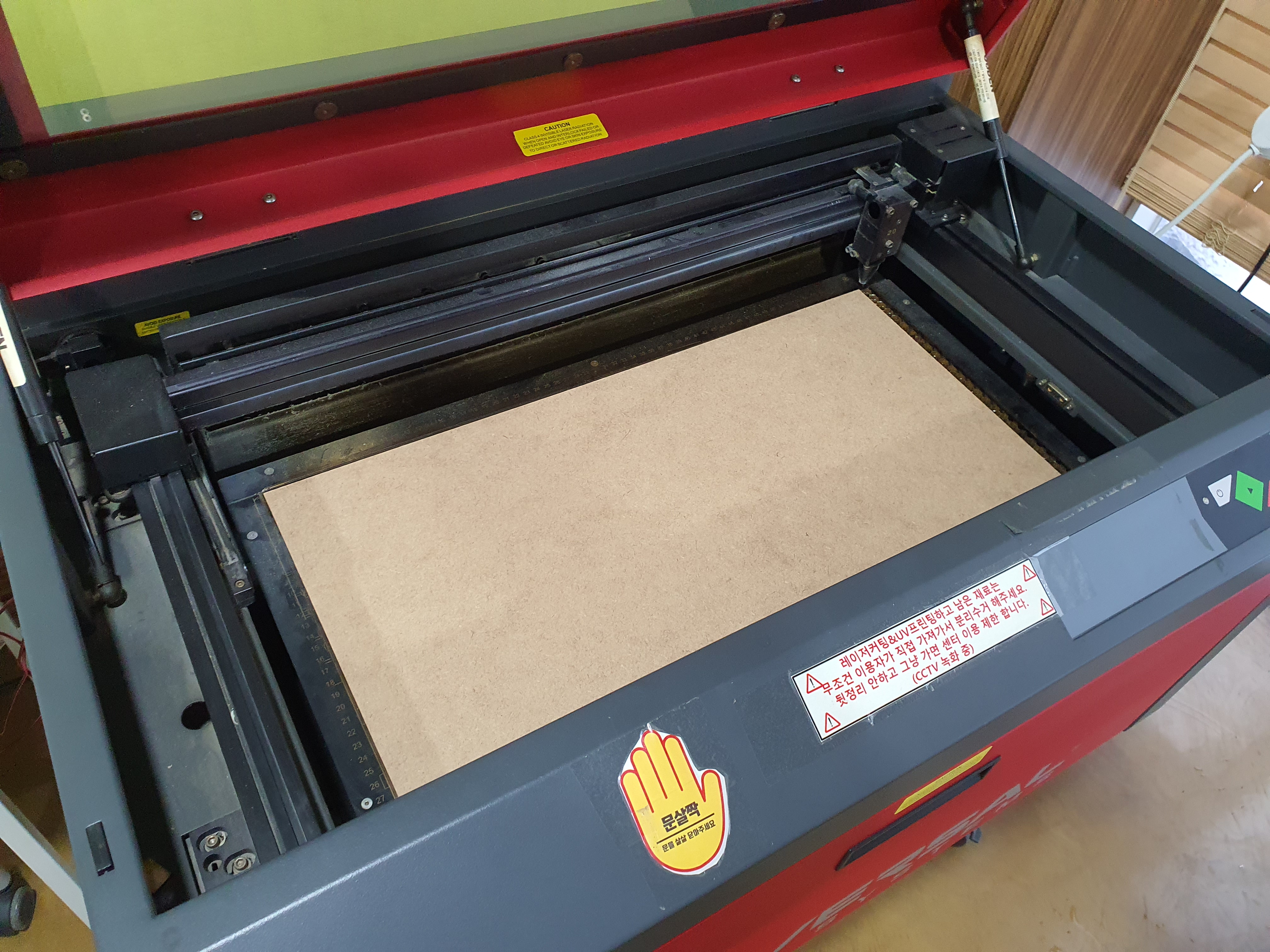 그 다음에는 레이저 커팅기에 목재를 넣어주고 그린 도면을 업로드 합니다.