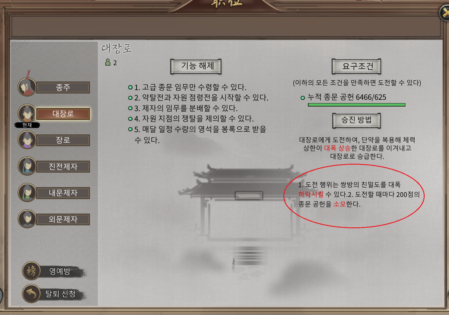 4. 문파원 승진 방법 설명에서 해당 문구의 줄 바꿈이 되어 있지 않아 매우 어색합니다.