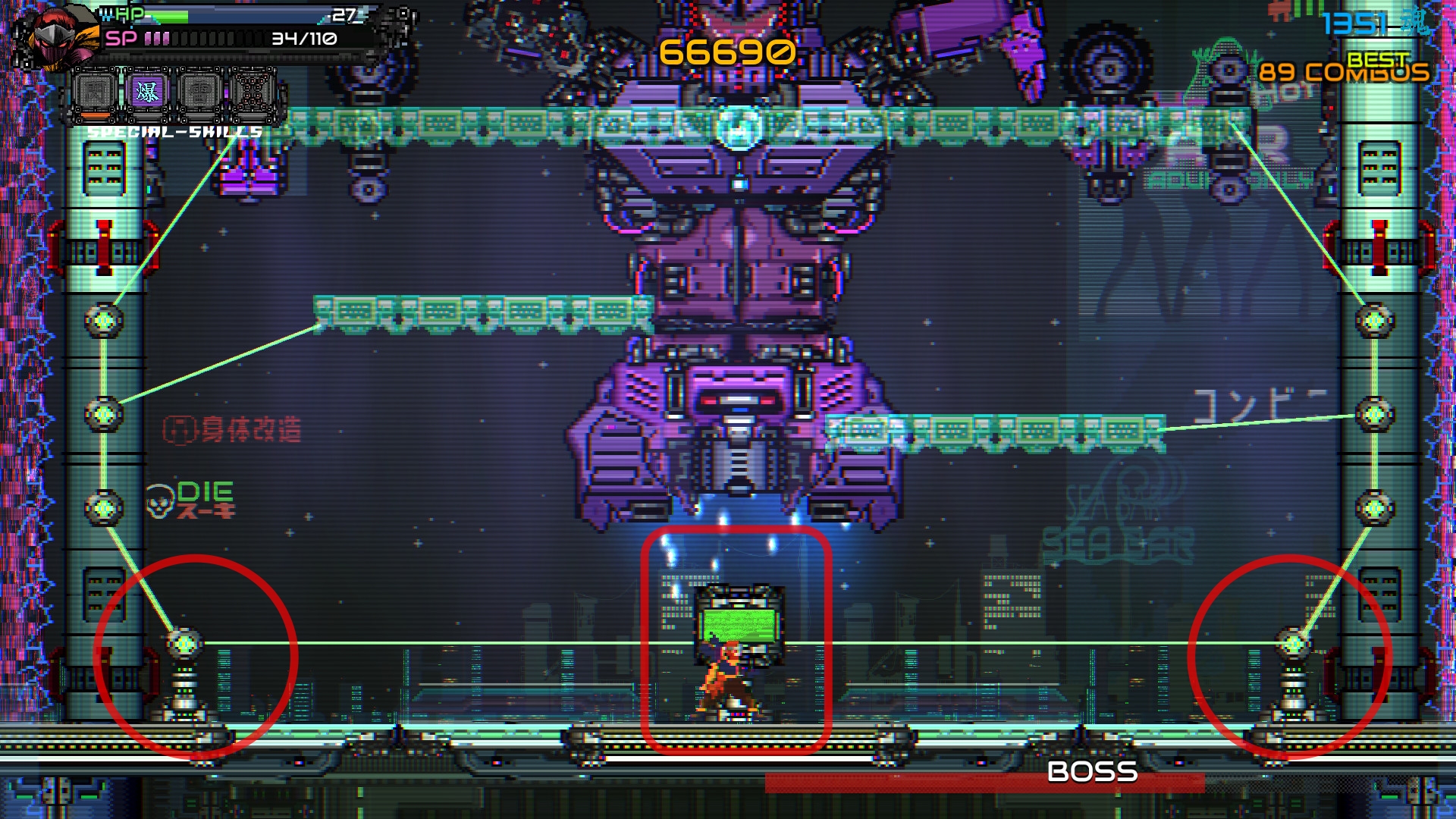 이 보스를 어렵다고 생각하는건 보스의 덩치가 있고 각 파츠별로 따로 부셔야 하고 보스가 미사일을 쏴대서 상대하기 까다롭다는건데 투명 발판 만들면 각 파츠별로 부수기 정말 쉬워지고, 벽에 매달리기 시작하면 미사일 공격의 사각지대를 금방 찾아냅니다.