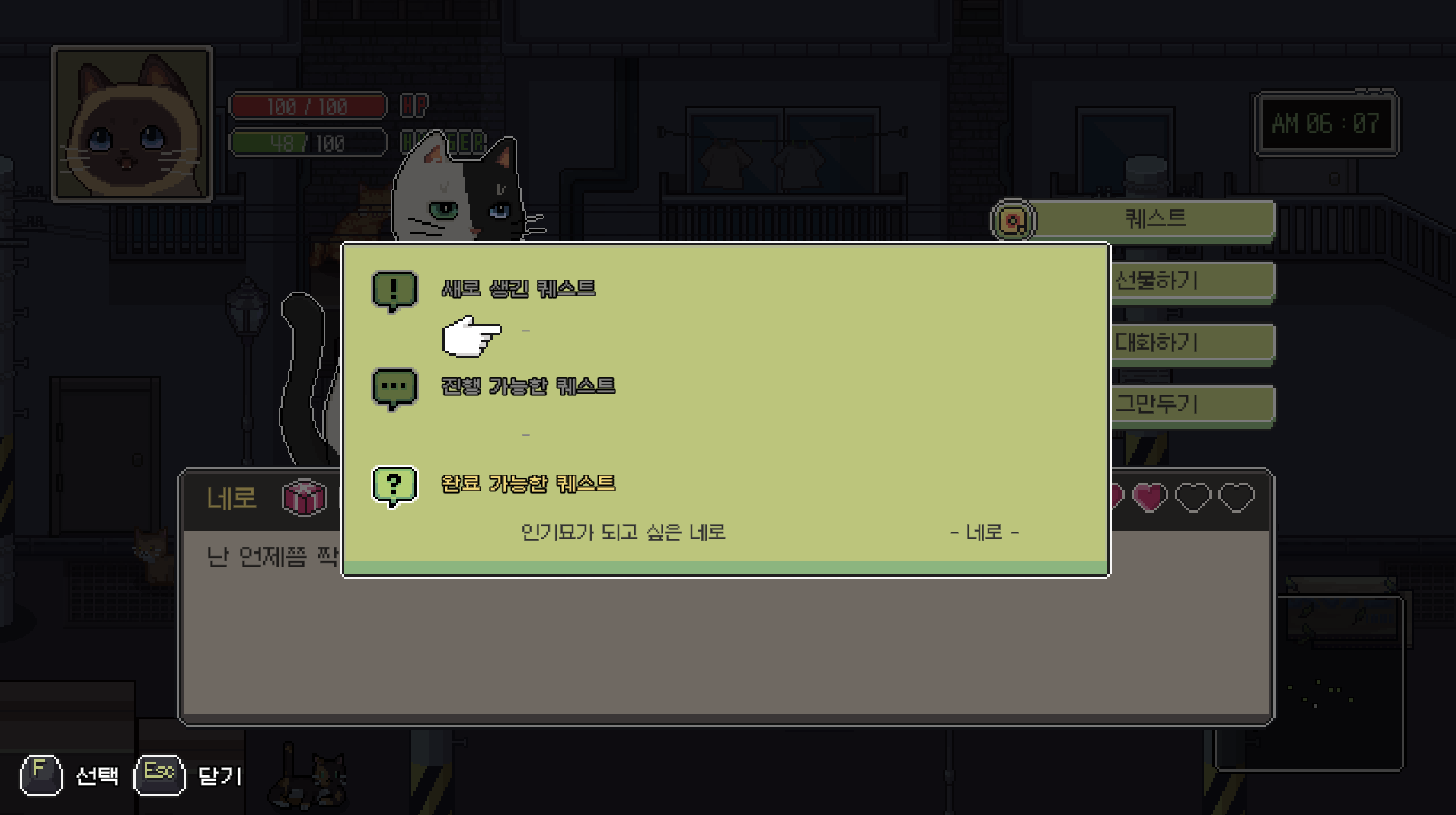 -사이드 퀘스트 ui 개선.(NPC와 대화시 퀘스트 버튼을 통해 현재 진행중인 퀘스트와 완료가능한 퀘스트 등을 확인 할 수 있게 되었습니다.