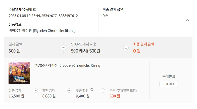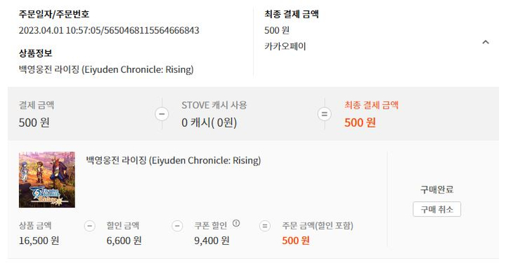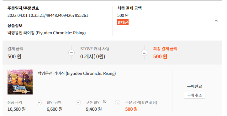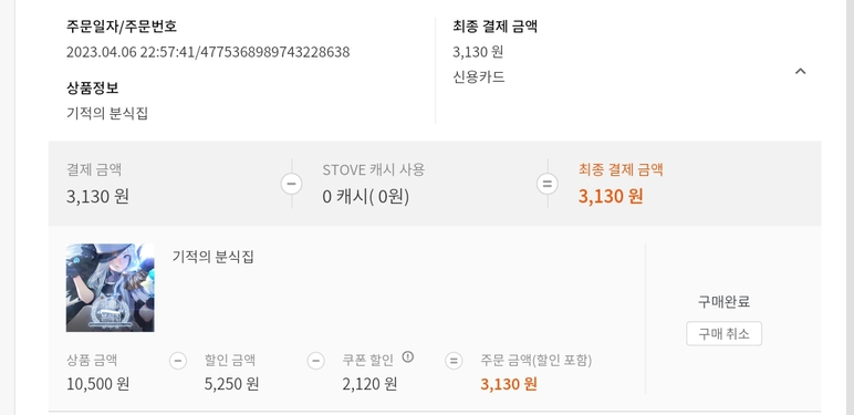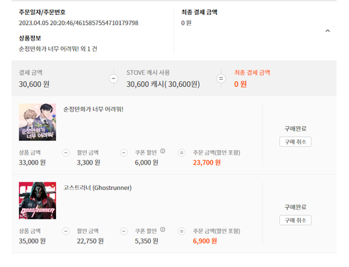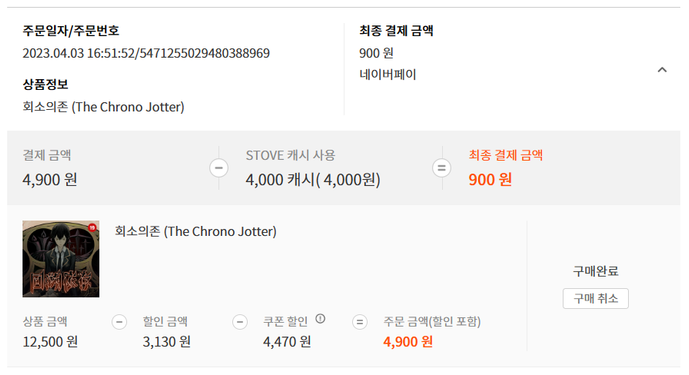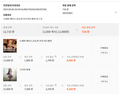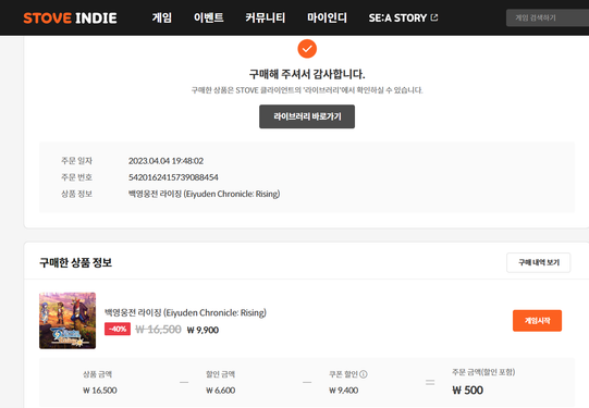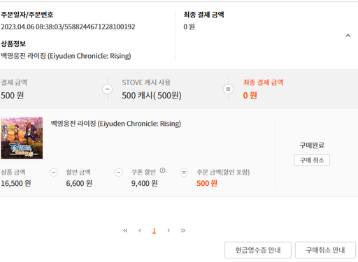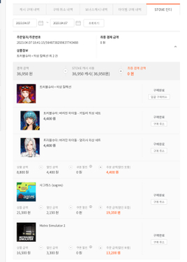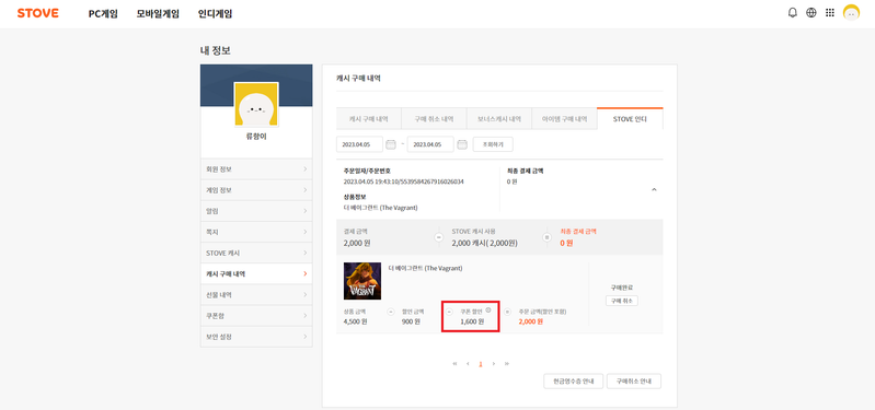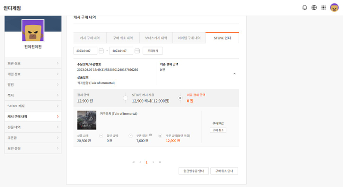 §'내정보 > 캐시 구매 내역 > STOVE 인디' 에서 구매 내역 캡쳐