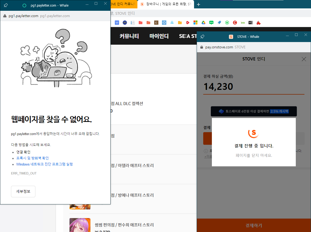 이거 토스페이 결제나 다른 결제방법들도 죄다 응답 대기시간 초과로 결제창이 뜨지 않아서 결제 진행을 못하고 있는데 어떻게 해결할까요?