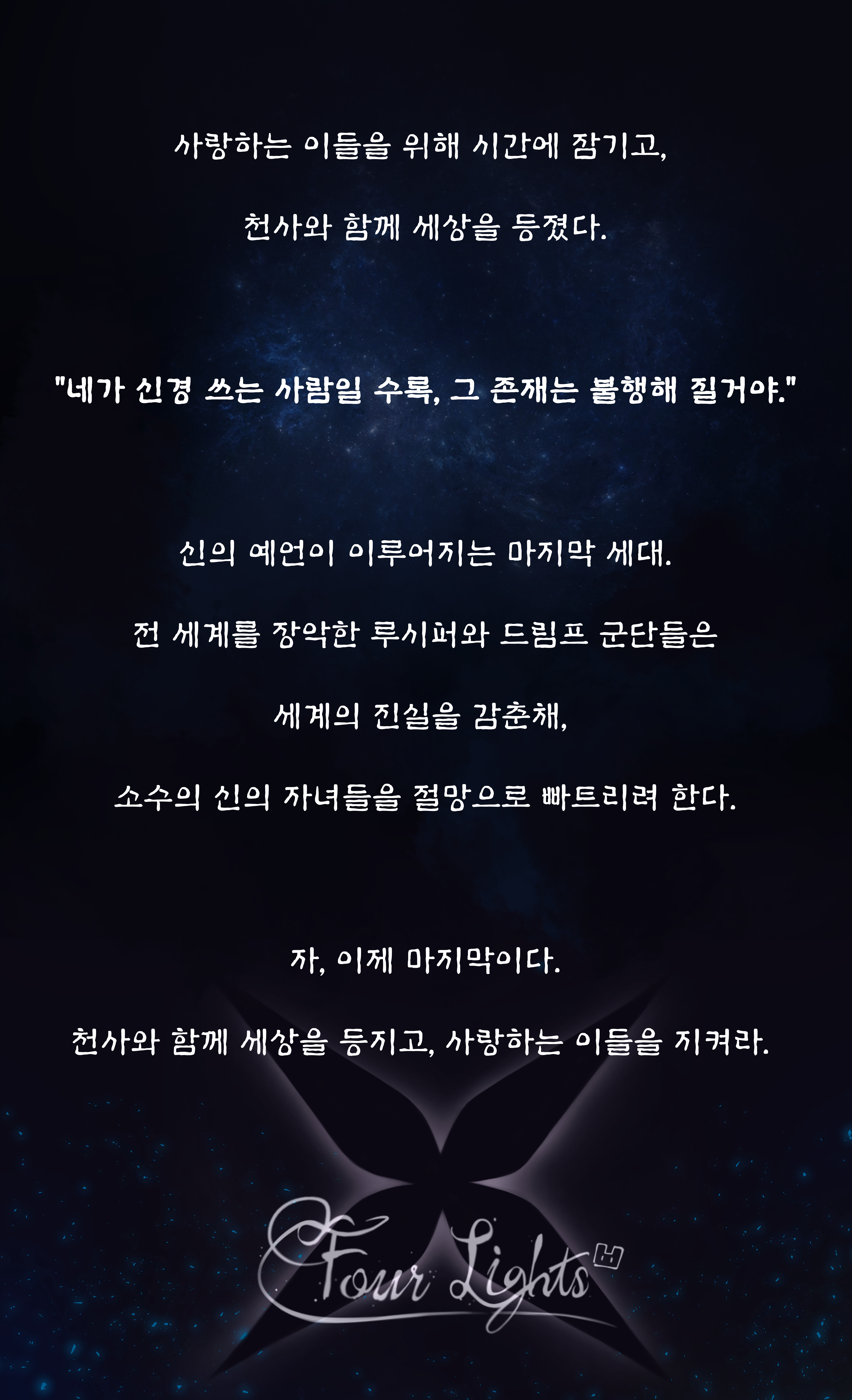 제 이야기 '네개의 빛' 의 메인 소재는 천사와 사탄(루시퍼)이 나오고, 초능력이 나오는 세계관입니다.