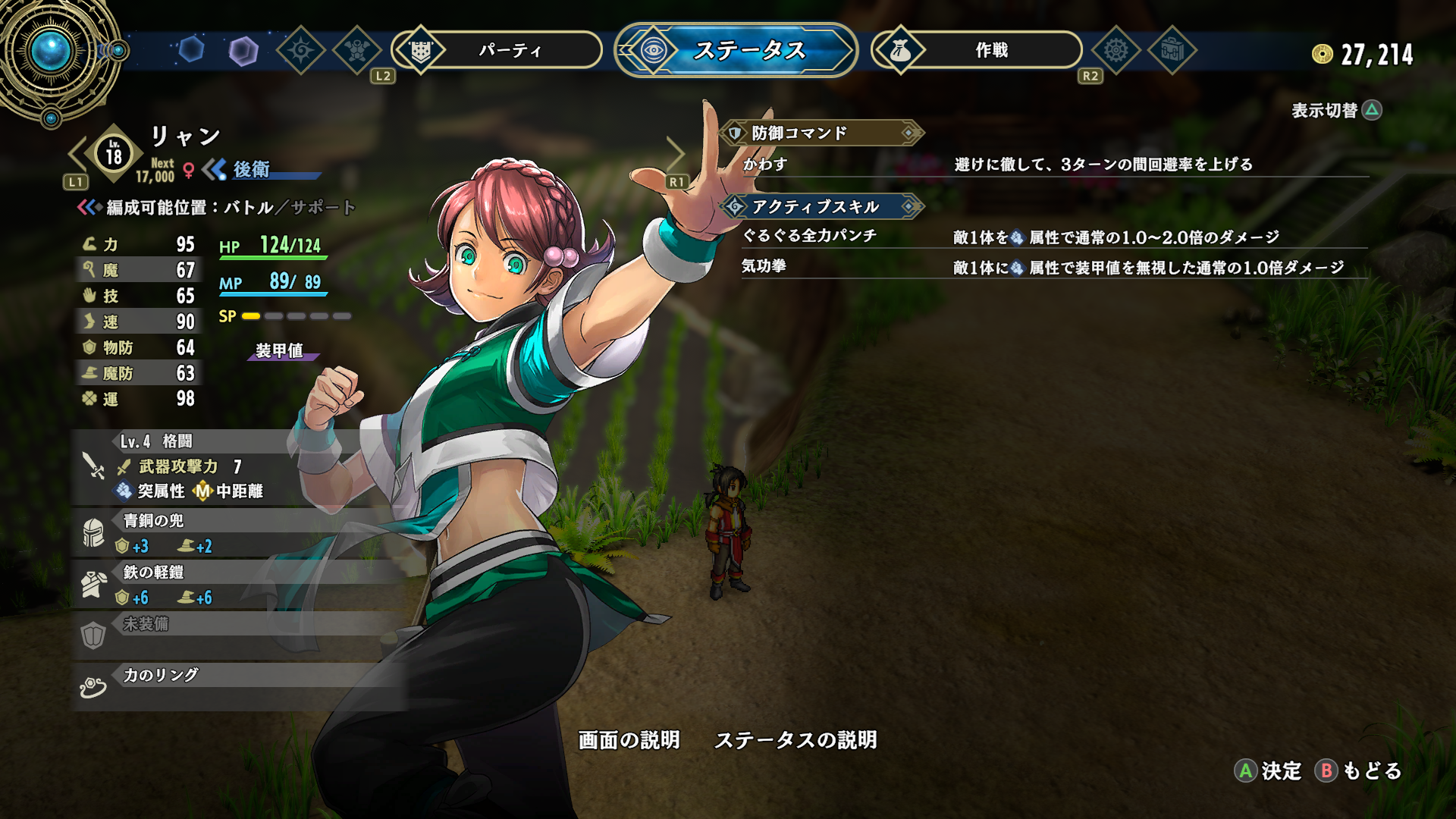 위 화면은 현재 제작 중인 상태 화면으로, 능력치, HP, MP등 캐릭터의 기본 능력, 장착 아이템과 효과, 그리고 사용 가능한 스킬 등을 한 번에 확인할 수 있습니다.