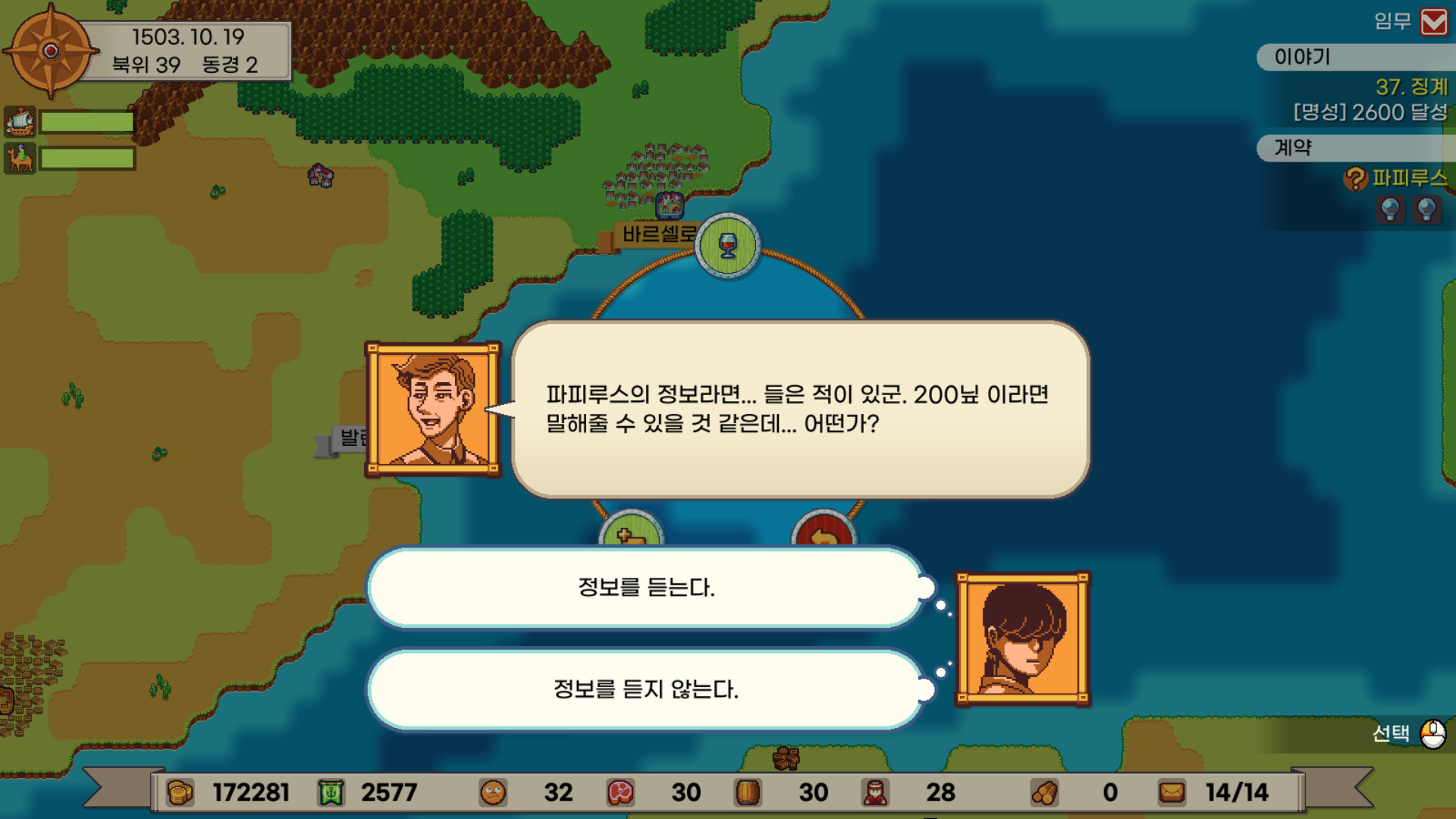 하지만 게임을 진행하면서 자잘한 불편한 점이 많다는 점 대항해시대를 간소화 시킨 게임임에도 꽉 조이는 난이도로 가볍게 즐기기 힘들다는 점 등은 개선할 필요가 있지 않나 합니다.