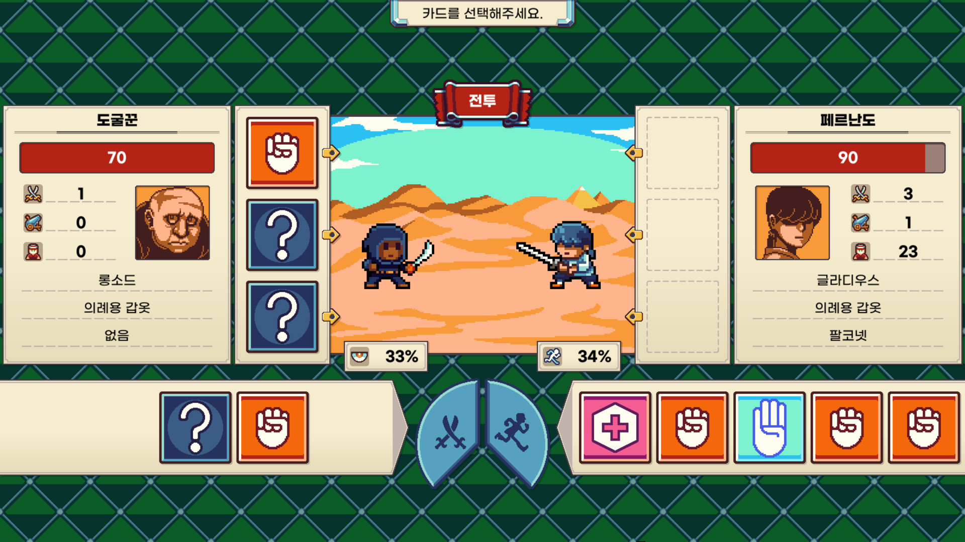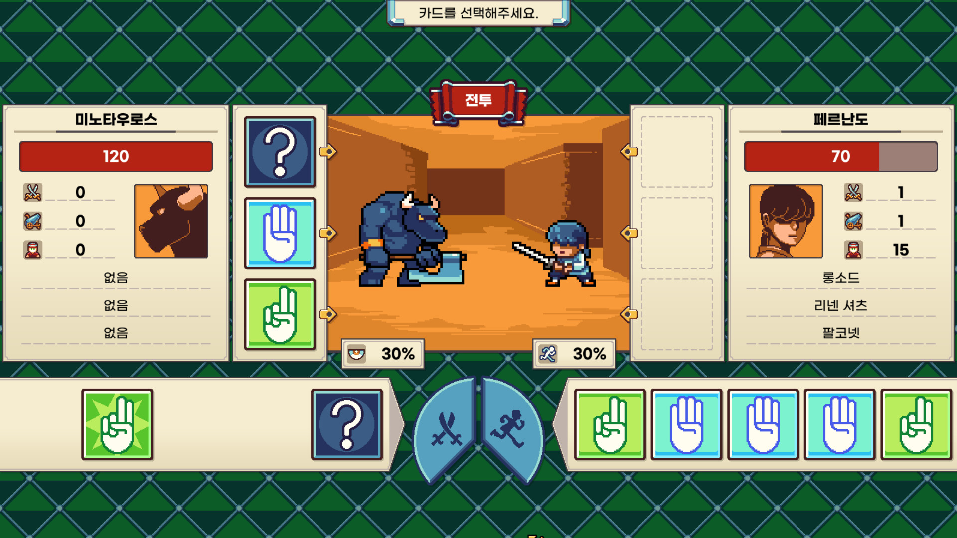 전투는 가위바위보로 구성됩니다. 상대에게 이기면 피해를 주고 이외에 특수 능력을 가진 카드들을 이용해서 전투를 유리하게 끌어가는 것이 전투의 기본입니다.