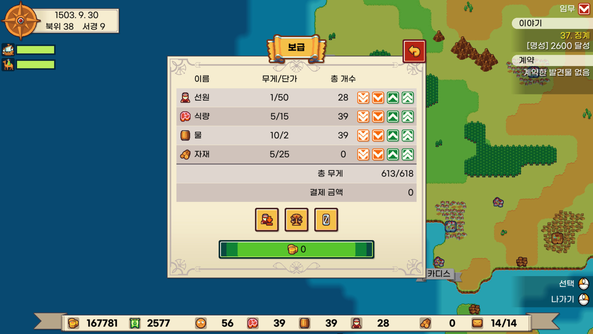이 게임은 대항해 시대처럼 보급량까지 줄여서 화물을 싣는 진행을 할 필요가 없고 언제나 최대로 보급을 할 수 있습니다. 그렇다면 항구에 들어갔을 때 보급과 수리를 자동으로 해주는 기능을 넣었다면 어땠을까 합니다.