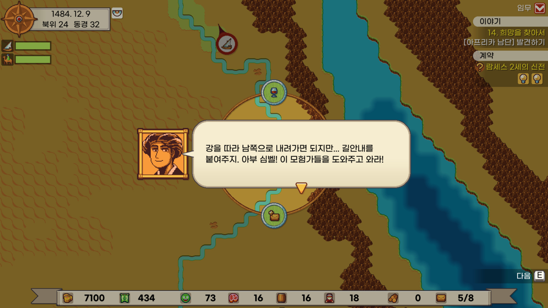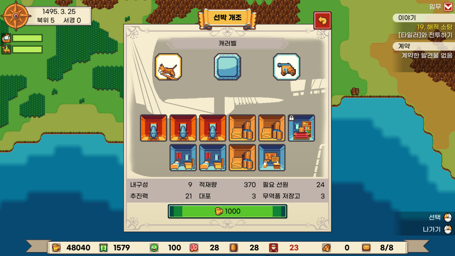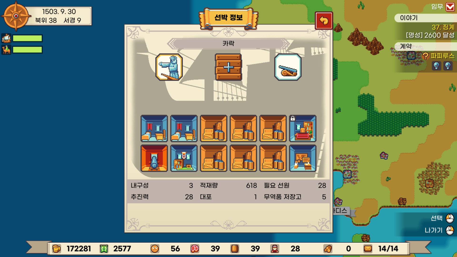 대항해 시대에선 이렇게 큰 배를 사고 큰 배를 강화하면 난이도가 크게 내려가는 반면 이 게임은 시작 배가 10~11일 정도를 항해할 수 있다면 큰 배로 바꾸고 식량 적재량을 아무리 늘려도 15일 이상 항해하기가 힘듭니다.