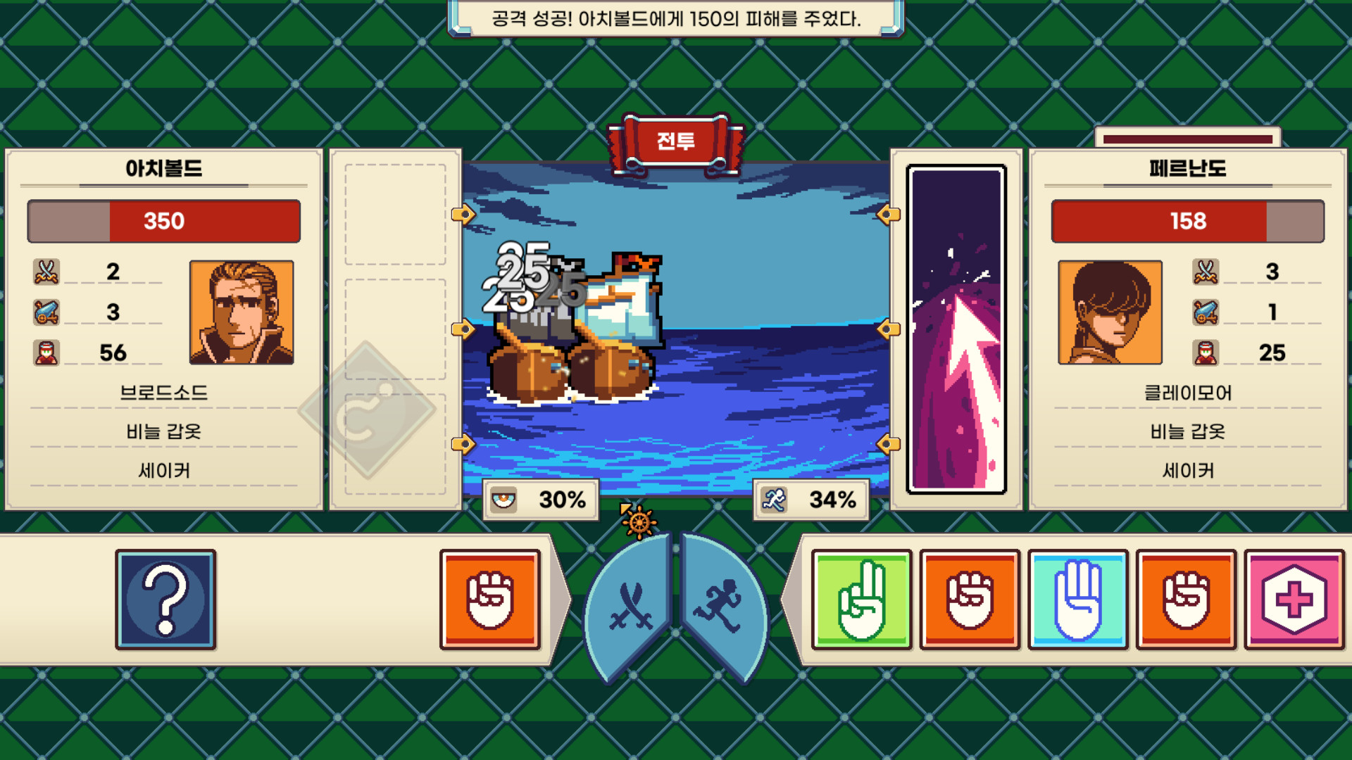 해상전은 게임을 진행하면서 충각처럼 필살기에 가까운 스킬이 생기기도 하고, 좋은 장비 또는 배에 장비하는 대포를 늘려서 공격력을 올릴 수 있지만 기본은 가위바위보의 상성을 통한 전투입니다.