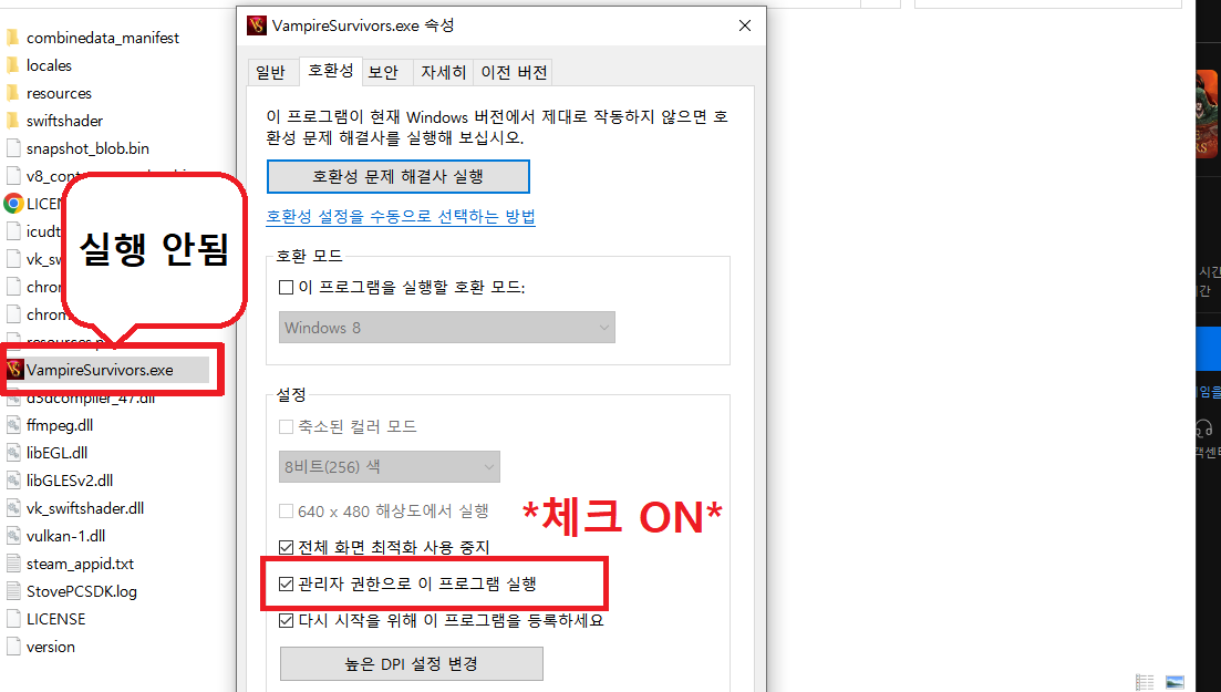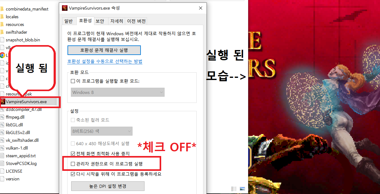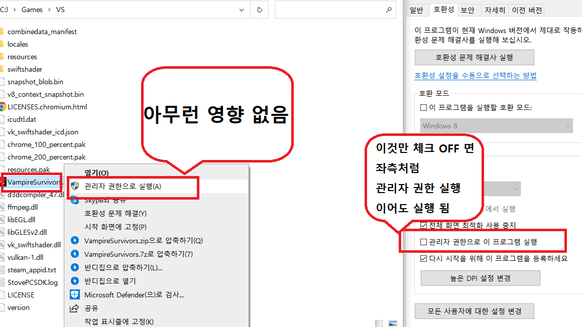 VampireSurvivors.exe 호환성 탭을 조정 하든 말든