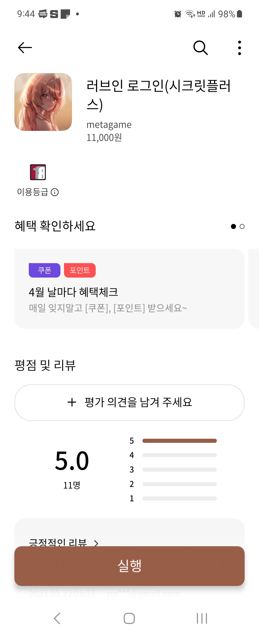 보시다시피 원스토어 버전은 시크릿 플러스, 즉 18금 버전입니다. play 스토어 버전은 15금입니다.